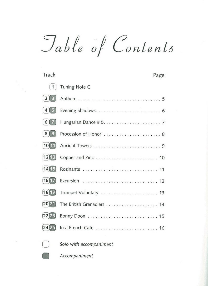 Anthem (Hannickel)Evening Shadows (Johnson)Hungarian Dance #5 (Brahms)Procession Of Honor (Johnson)Ancient Towers (Craig)Copper And Zinc (Lindsay)Rozinante (Hannickel)Excursion (Johnson)Trumpet Voluntary (Clarke)The British Grenadiers (traditional)Bonny Doon (Miller)In A French Cafe (Hannickel)
