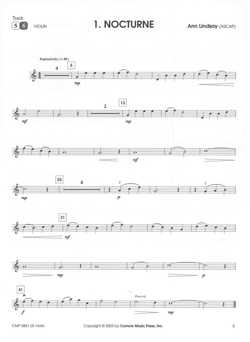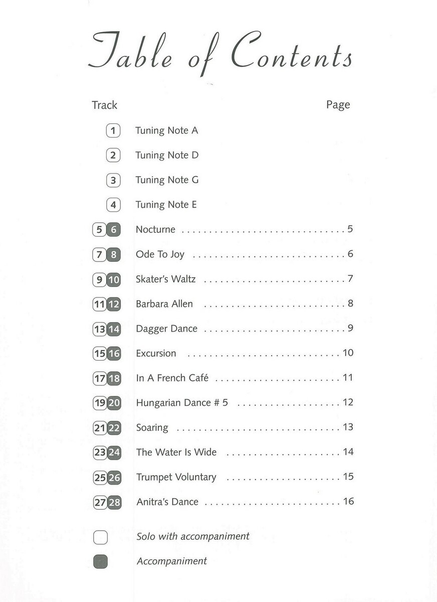 NocturneOde To Joy (Beethoven)Skater's WaltzBarbara AllenDagger Dance from Natoma (Herbert)ExcursionIn A French CafeHungarian Dance #5 (Brahms)SoaringThe Water Is WideTrumpet Voluntary (Clarke)Anitra's Dance (Grieg)