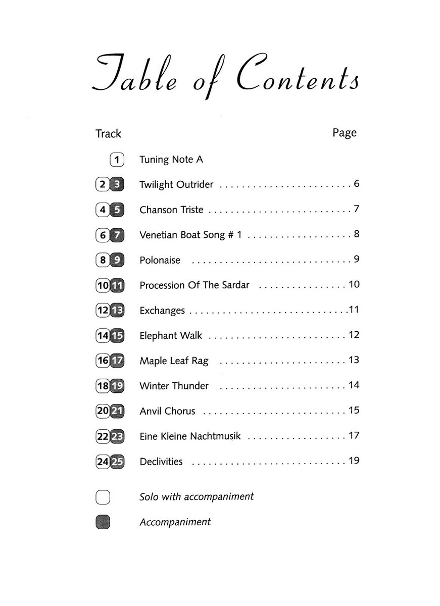Twilight OutriderChanson Triste (Tchaikovsky)Venetian Boat Song # 1 (Mendelssohn)Polonaise Op.53 (Chopin)Procession Of The Sardar (Ippolitov-Ivanov)Exchanges - For Two TimpaniElephant WalkMaple Leaf Rag (Joplin)Winter ThunderAnvil Chorus (Verdi)Eine Kleine Nachtmusik (Mozart)Declivities