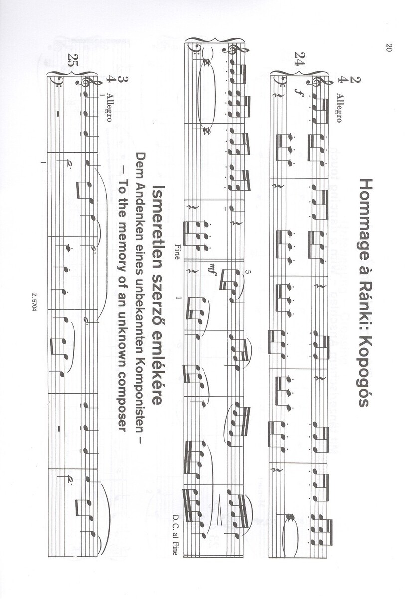 Look for parallels!Pentachord without the use of the 4th fingerPentachord without the use of the 4th fingerResponsesResponsesAnswering backAccompaniment in classical mannerA somewhat tricky imitationContrary motionContrary motion (together-apart)Meters against one anotherSyncopationFanfareMelody with resonanceThe same with martellatoForte-pianoStaccato-legatoInterchanging partsPentachord filled up differentlyInterchanging partsAlternatingCrossingWith a dancing touchKopogósTo the memory of an unknown composerTo the memory of an unknown composerTo the memory of an unknown composer