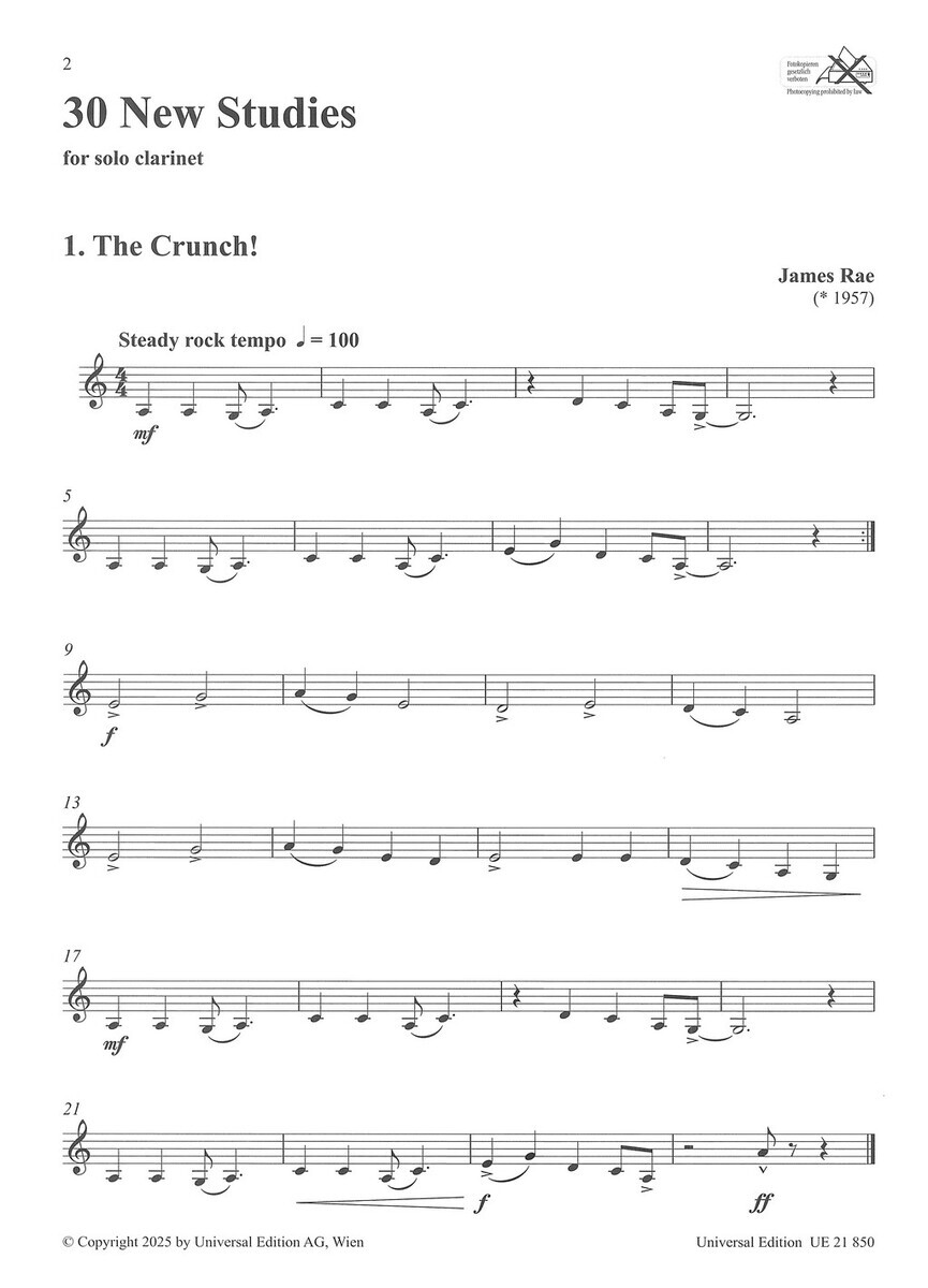 „30 New Studies fo Clarinet“ (30 nových etudy pro klarinet) je sbírka lehkých až středně obtížných etud, které napsal anglický skladatel James Rae, a představuje klarinetistům různé hudební styly jako jsou rock, swing, latinsko-americká hudba a klasická hudba. Sbírka slouží zároveň jako přípravný materiál na navazující sešit „40 Modern Studies for Solo Clarinet“ (kod: UE19735).
