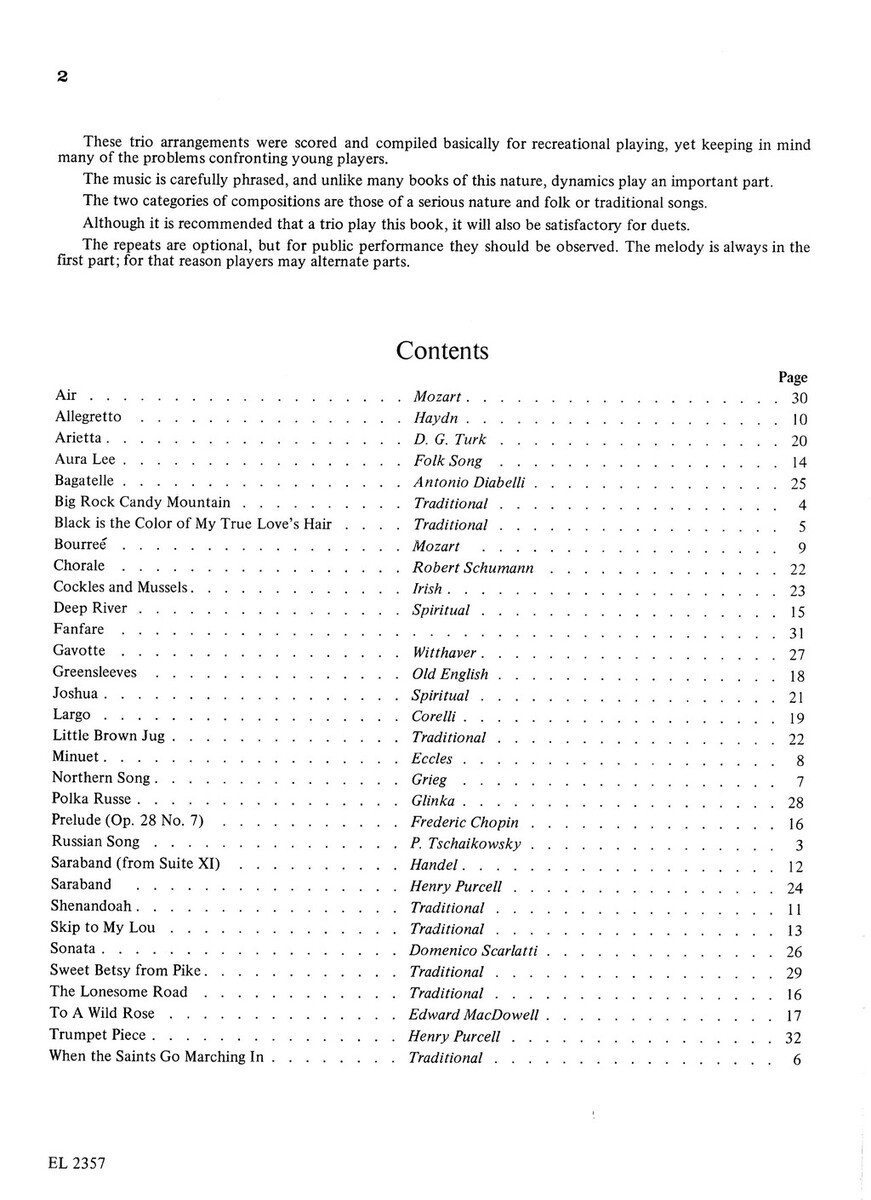 Air (Mozart)Allegretto (Haydn)Arietta (D.G.Turk)Aura LeeBagatelle (A.Diabelli)Big Rock Candy MountainBlack is the Color of My True Love´s HairBourreé (Mozart)Chorale (R.Schumann)Cockles and MusselsDeep RiverFanfareGavotteGreensleevesJoshuaLargo (Corelli)Little Brovn JugMinuet (Eccles)Northern Song (Grieg)Polka Russe (Glinka)Prelude Op.28 No.7 (F.Chopin)Russian Song (P.Tschaikowsky)Saraband (Handel)Saraband (Henry Purcell)ShenandoahSkip to My LouSonataSweet Betsy from PikeThe Lonesome RoadTo A Wild RoseTrumpet PieceWhen the Saints Go Marching In