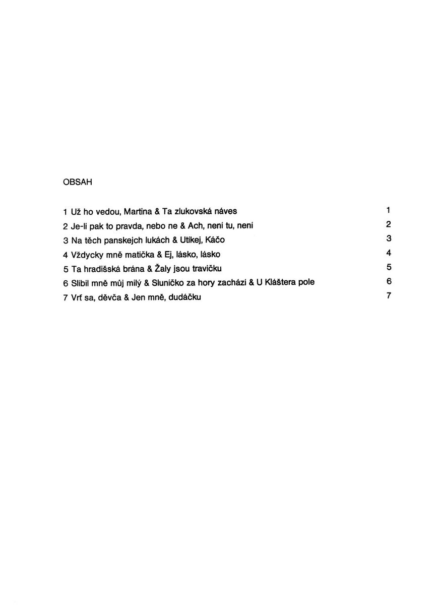 Už ho vedou& Ta zlukovská návesJe-li pak to pravda, nebo ne& Ach, není tu, neníNa těch panskejch lukách& Utíkej KáčoVždycky mně matička& Ej, lásko, láskoTa hradišská brána&Žaly jsou travičkuSlibil mně můj milý& Sluníčko za hory zachází& U Kláštera poleVrť sa, děvča& Jen mně, dudáčku