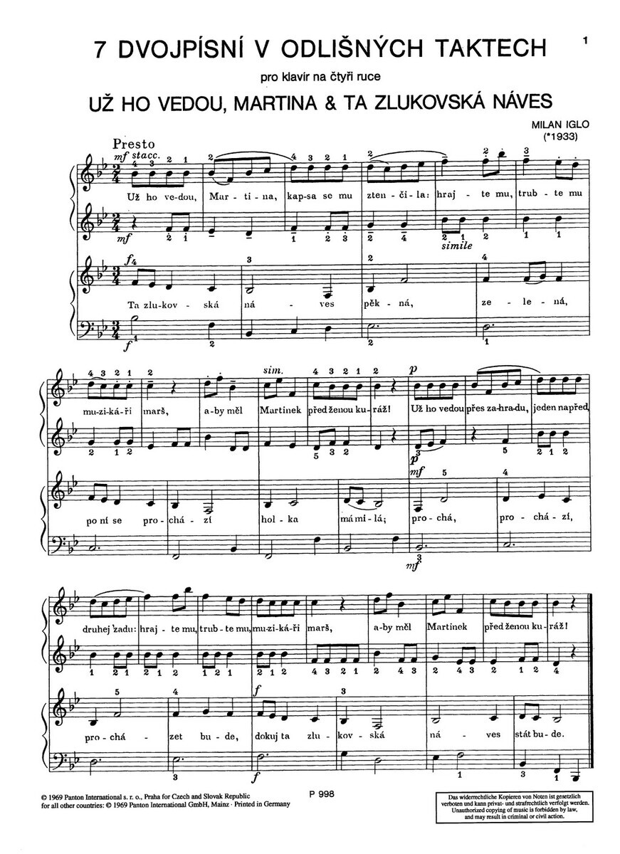 Milan Iglo (1933) -český skladatel a učitel.Studoval skladbu u Emila Hlobila na pražské konzervatoři (1955–58) a Hudební fakultu AMU u Pavla Bořkovce (1958–62).Je autorem mnoha instruktivních, sborových, klavírních, komorních i orchestrálních skladeb. Tento sešit Vám přináší jeho velmi zajímavý pokus, ve kterém pro Vás hledal a našel a zaranžoval do jedné čtyřruční skladby dvě lidové písně v odlišných taktech. Chcete-li si zahrát něco opravdu zvláštního, zajímavého, nestandardního, ale zároveň příjemného a jednoduchého, pak je tento sešit určen právě Vám !!! Obtížnost 3+