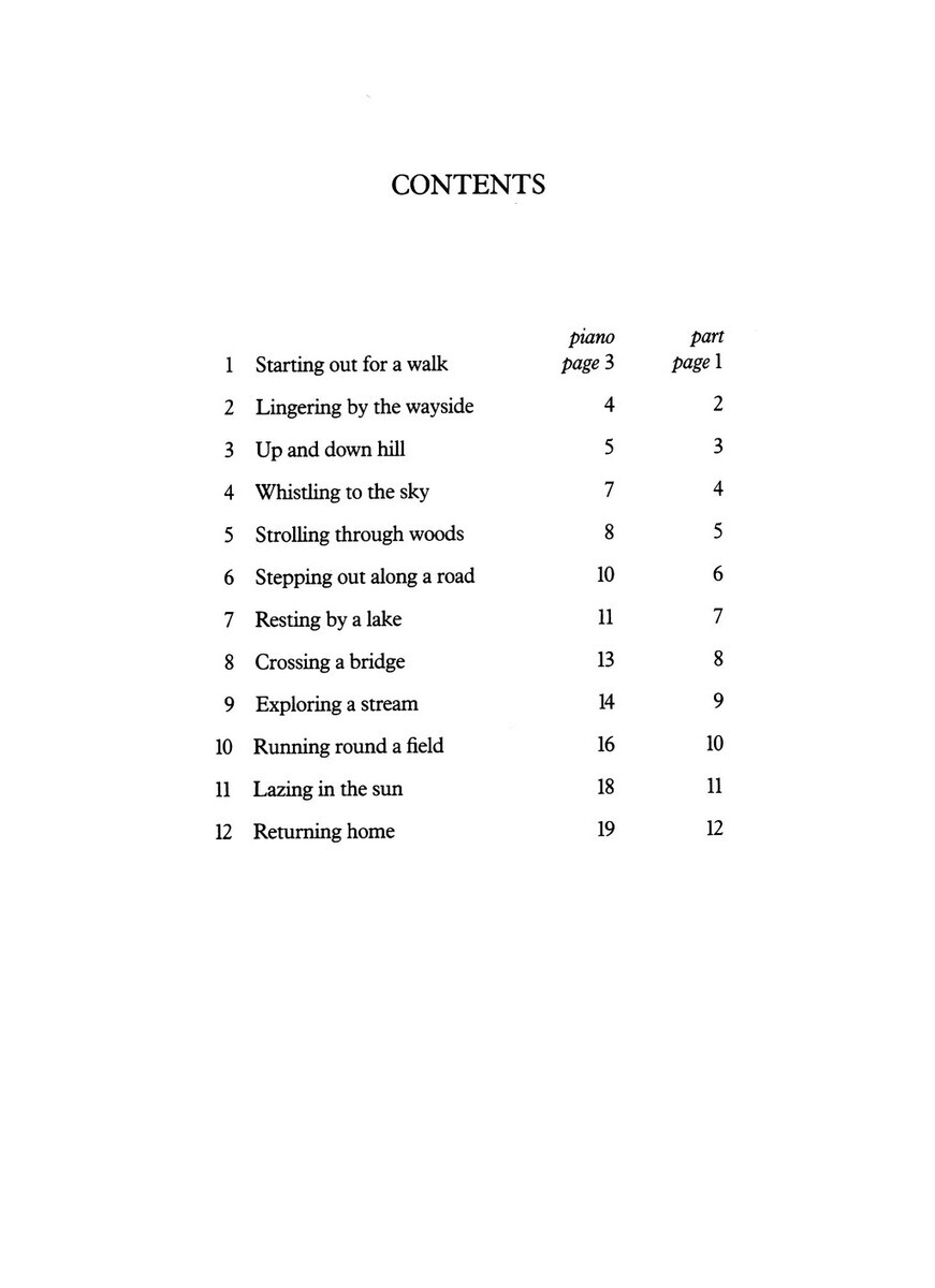 Starting out for a walkLingering by the waysideUp and down hillWhistling to the skyStrolling trough woodsStepping out along a roadResting by a lakeCrossing a bridgeExploring a streamRunning round a fieldLazing in the sunReturning home