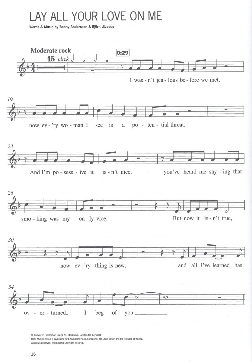 Titul série JUNIOR GUEST SPOT, který obsahuje 15 skladeb skupiny ABBA. Všechny skladby jsou v jednoduchém aranžmá, snadnější tónině a lehčím rytmu, aby se začínajícím hudebníkům dobře hráli. Pod melodickou linkou je uveden také text písní. Na přiloženém CD je každá skladba nahrána 2x, jednou v plném znění a po druhé pouze doprovod pro Vaši hru. Navíc je v sešitě velmi pěkně zpracován popis nástroje a prstoklad pro daný nástroj. Povedený titul !!!