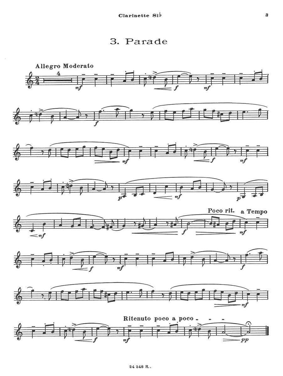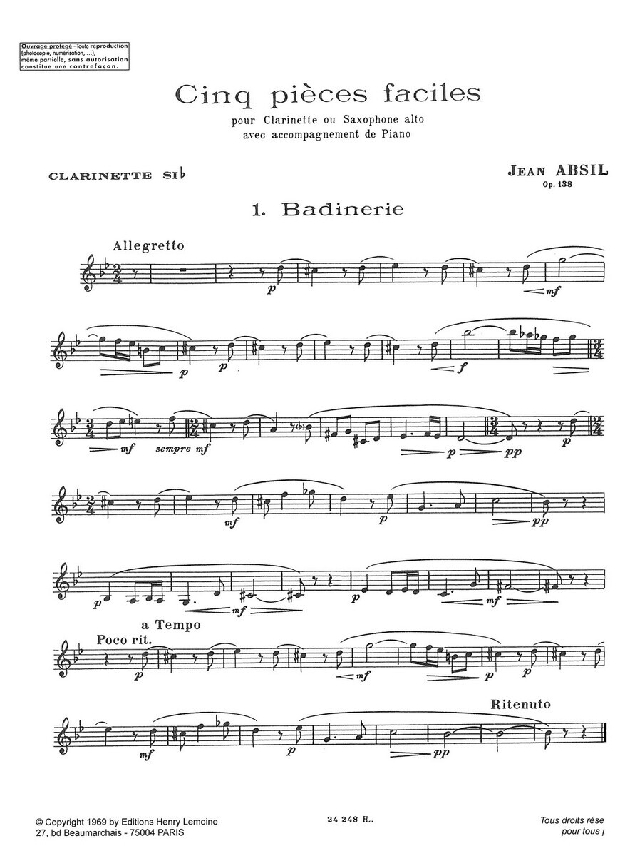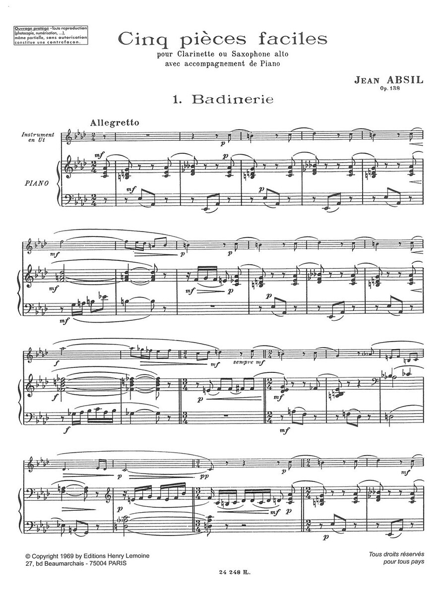 „5 Pièces faciles Op. 138“ je sbírka pěti krátkých skladeb (Badinerie, Chant de Marins, Parade, Spleen, Joyeux départ) pro klarinet nebo altový saxofon a klavír, které napsal belgický skladatel Jean Absil. Sešit obsahuje klavírní doprovod plus samostatně vložené party pro klarinet a altový saxofon. Příjemně melodické skladby, které vyžadují cit pro rytmus a frázování.  Skladby jsou vhodné pro hráče na klarinet nebo saxofon, kteří hledají vhodný repertoár současné hudby pro koncerty, recitály nebo soutěže.