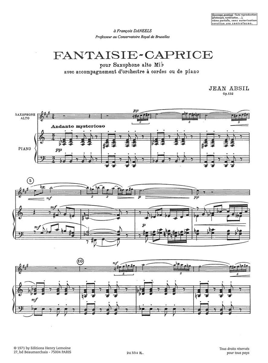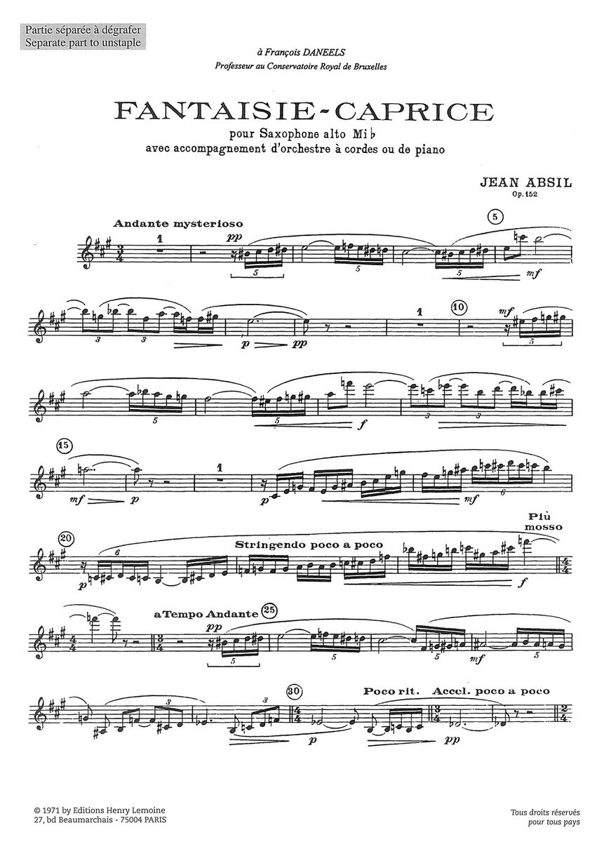 „Fantaisie-Caprice“ je skladba,  kterou belgický skladatel Jean Absil napsal v roce 1971 pro altový saxofon a orchestr. Nyní Vám tuto skladbu přinášíme v úpravě pro altový saxofon a klavír.