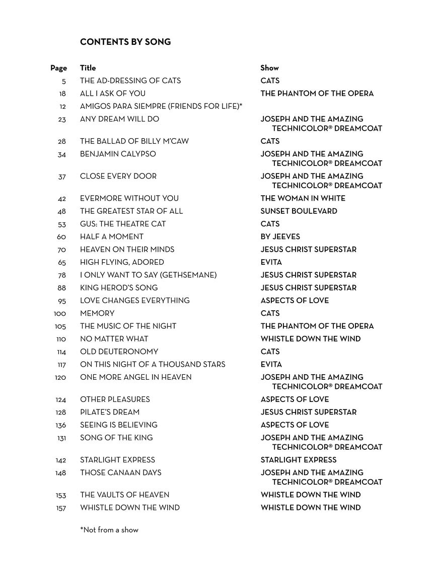 Love Changes Everything - Aspects of LoveOther Pleasures - Aspects of LoveSeeing is Believing - Aspects of LoveHalf a Moment - By JeevesThe Ad-dressing of Cats - CatsThe Ballad of Billy M'Caw - CatsGus: The Theatre Cat - CatsMemory - CatsOld Deuteronomy - CatsHigh Flying, Adored - EvitaOn This Night of a Thousand Stars - EvitaHeaven on Therir Mind - Jesus Christ SuperstarI Only Want to Say - Jesus Christ SuperstarKing Herod's Song - Jesus Christ SuperstarPilate's Dream - Jesus Christ SuperstarAny Dream Will Do - Joseph and the Amazing Technicolor DreamcoatBenjamin Calypso - Joseph and the Amazing Technicolor DreamcoatClose Every Door - Joseph and the Amazing Technicolor DreamcoatOne More Angel in Heaven - Joseph and the Amazing Technicolor DreamcoatSong of the King - Joseph and the Amazing Technicolor DreamcoatThose Canaan Days - Joseph and the Amazing Technicolor DreamcoatAll I Ask of You - The Phantom of the OperaThe Music of the Night - The Phantom of the OperaStarlight Express - Starlight ExpressThe Greatest Star of All - Sunset BoulevardNo Matter What - Whistle Down the WindThe Vaults of Heaven - Whistle Down the WindWhistle Down the Wind - Whistle Down the WindEvermore Without You - The Woman in the WhiteAmigos Para Siempre/Friend For Life - Olympic Theme