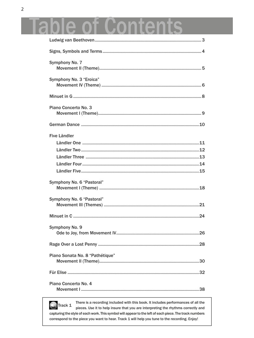 Symphony No. 7Symphony No. 3 "Eroica"Minuet in GPiano Concerto No. 3German DanceFive Ländler-Ländler OneFive Ländler-Ländler TwoFive Ländler-Ländler ThreeFive Ländler-Ländler FourFive Ländler-Ländler FiveSymphony No. 6 "Pastoral" ISymphony No. 6 "Pastoral" IIIMinuet in COde To JoyRage Over A Lost PennyPiano Sonata No. 8 "Pathétique"Für ElisePiano Concerto No. 4
