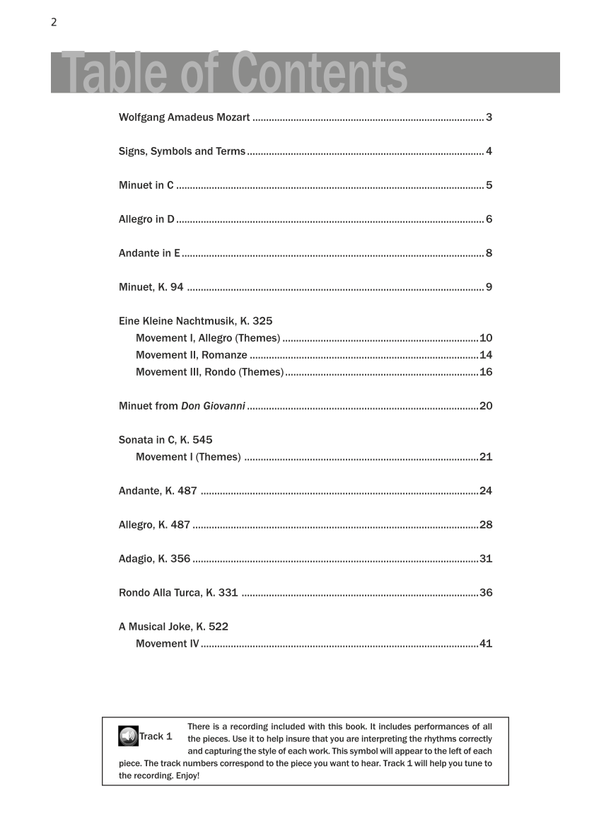 Menuet in CAllegro in DAndante in EMenuet, K.94Eine Kleine Nacht Musik, K.325-Movement IEine Kleine Nacht Musik, K.325-Movement IIEine Kleine Nacht Musik, K.325-Movement IIIMinuetSonata in C, K. 545Andante, K.487Allegro, K. 487Adagio, K.356Rondo Alla Turca, K. 331A Musical Joke, K. 522