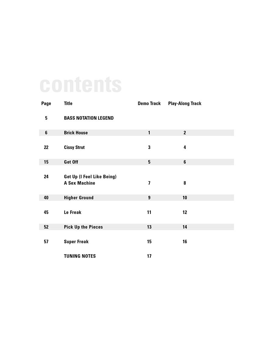 Brick HouseCissy StrutGet OffGet Up (I Feel Like Being) A Sex MachineHigher GroundLe FreakPick Up The PiecesSuper Freak