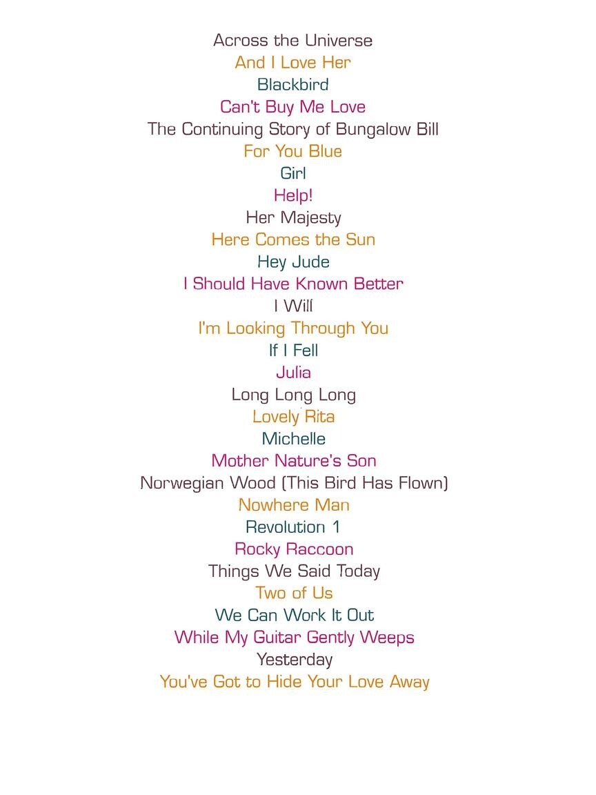 Across The UniverseAnd I Love HerBlackbirdCan't Buy Me LoveThe Continuing Story Of Bungalow BillFor You BlueGirlHelp!Her MajestyHere Comes The SunHey JudeI Should Have Known BetterI WillI'm Looking Through YouIf I FellJuliaLong Long LongLovely RitaMichelleMother Nature's SonNorwegian Wood (This Bird Has Flown)Nowhere ManRevolution 1Rocky RaccoonThings We Said TodayTwo Of UsWe Can Work It OutWhile My Guitar Gently WeepsYesterdayYou've Got To Hide Your Love Away