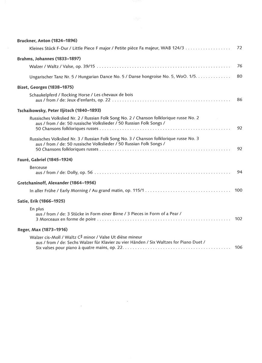 „Best of Piano Duets“ je sbírka dvaceti skladeb pro čtyřruční klavír, které editor Hans-Günter Heumann vybral z klavírní literatury různých období evropské klasické hudby. Kolekce přináší výběr známých a hudebně atraktivních skladeb autorů jako Joseph Haydn, Wolfgang Amadeus Mozart, Ludwig van Beethoven, Franz Schubert nebo Johannes Brahms. Skladby jsou sestaveny tak, aby vytvořily stylově pestrý program od klasických tanečních kusů přes lyrické skladby až po virtuóznější koncertní čísla. Úprava pro čtyřruční hru umožňuje hráčům rozvíjet souhru, práci s dynamikou i společné frázování a zároveň přináší radost ze společné hry u jednoho klavíru. Notový zápis obsahuje prstoklady a další interpretační pokyny, které usnadňují studium i společné zkoušení. Publikace je vhodná především pro mírně pokročilé klavíristy, kteří chtějí rozšířit svůj repertoár o známé skladby klasické hudby pro čtyřruční klavír.