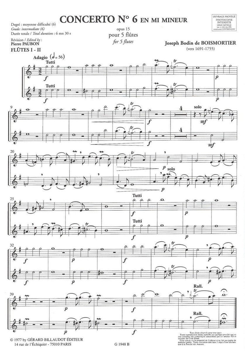 BOISMORTIER: CONCERTO No.6 E minor Op. 15 / skladba pro 5 příčných fléten