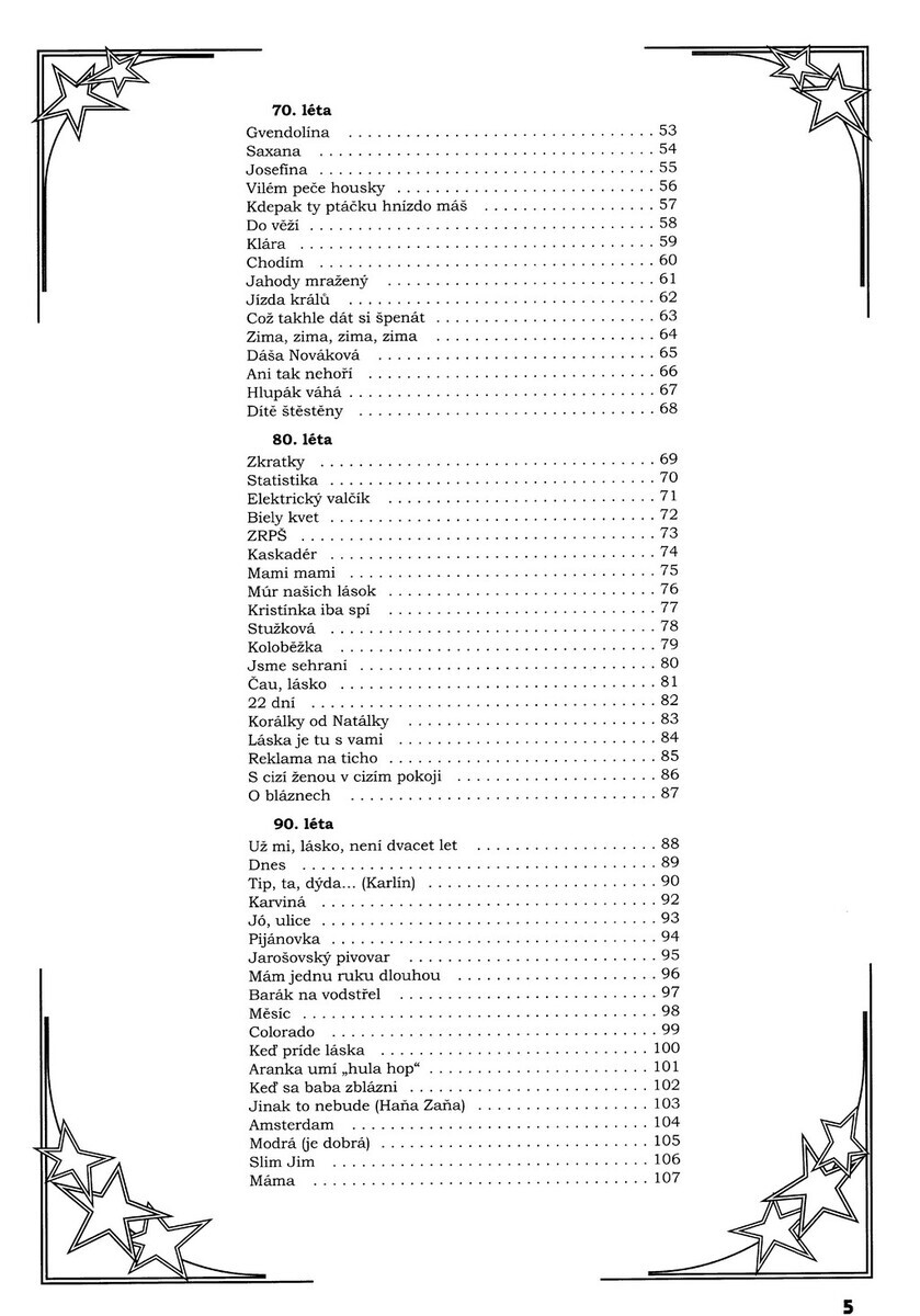 Já miluji jen vásRůžové psaníčkoEzop a brabenecŽivot je jen náhodaNikdy se nevrátí pohádka mládíStrahováčekPíseň zapadákuPíseň severuJednu nocíSám s děvčetem v děštiPřednosta staniceNesmůť za mnouNečakaj ma už nikdyDárek na památkuPrečo sa máme rozísťRodný mój krajKupředu, zpátky ni krokVáš dům šel spátSanta LuciaCestářKos ašvecLavička v jasmínuČervená aerovkaVčera neděle bylaJe po děštiTvé vlasy kvetouPozdrav astronautoviOči sněhem zavátéTam za vodou v rákošíTerezaWhisky to je moje gustoČervená řekaÁrie měsíceJó, to jsem ještě žilSvou lásku jsem rozdalTrezorHvězda na vrběJá a můj synObraz doriana GrayeHospodaVálka je vůlVzdálený hlasLady CarnevalTo se nikdo nedovíZrcadloSeď a tiše poslouchejGvendolínaSaxanaJosefínaVilém peče houskyKdepak ty ptáčku hnízdo mášDo věžíKláraChodímJahody mraženýJízda králůCož takhle dát si špenátZima, zima, zima, zimaDáša NovákováAni tak nehoříHlupák váháDítě štěstěnyZkratkyStatistikaElektrický valčíkBiely kvetZRPŠKaskadérMami mamiMúr našich lásokKristínka iba spíStužkováKoloběžkaJsme sehraníČau lásko22 dníKorálky od NatálkyLáska je tu s vamiReklama na tichoS cizí ženou v cizím pokojiO BláznechUž mi, lásko, není dvacet letDnesTip, ta, dýdaKarvináJó, ulicePijánovkaJarošovský pivovarMám jednu ruku dlouhouBarák na vodstřelMěsícColoradoKeď příde láskaAranka umí hula hopKeď sa baba zblázniJinak to nebudeAmsterdamModrá je dobráSlim JimMáma