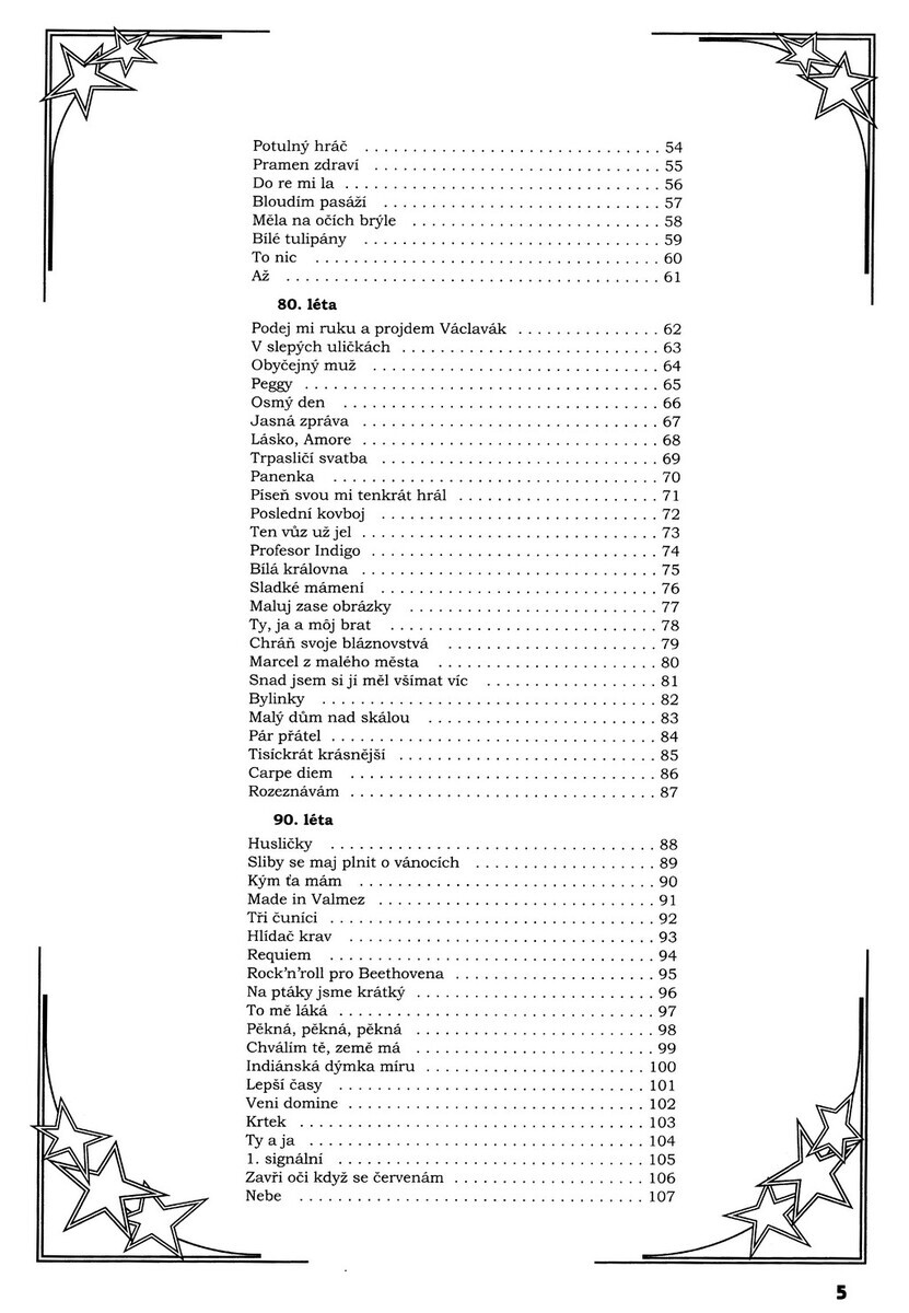 Dájo, nevolejNebe na zemiLetí šípPraha je krásnáPovím to tancem a písníSám já chodívám rádBiele margarétyRozvíjej se poupátkoMuzikantova písničkaSkôr než odídešBlues na cestu posledníZhasněte lampiónyHonky-tonky bluesSentimentálníNej, nej, nejBabettaDříve nž rozkvete kvítíNáramekZtracená bačkorkaLékořiceRůže z TexasuBedna vod whiskyMariaNářek převozníkaPojď se mnou, lásko máSlza z tváře padáDětský očiPokojč.26Odpovím ti lalalaŠípková RůženkaModlitba pro MartuRing-o-ding1000 nových jmenEstherHoupaváHastrmane, tatrmanePtám se vás lidéSlzy tvý mámy šedivýAžmi bude stoOd zítřka máme dovolenouAž jednou červánkyKamarádNáš vor plul dálJezZažniMít rádPotulný hráčPramen zdravíDo re mi laBloudím pasážíMěla na očích brýleBílé tulipányTo nicAžPodej mi ruku a projdem VáclavákV slepých uličkáchObyčejný mužPeggyOsmý denJasná zprávaLásko, AmoreTrpasličí svatbaPanenkaPíseň svou mi tenkrát hrálPoslední kovbojTen vůz už jelProfesor IndigoBílá královnaSladké mámeníMaluj zase obrázkyTy, já a môj bratChráň svoje bláznovstváMarcel z malého městaSnad jsem si jí měl všímat vícBylinkyMalý dům nad skálouPár přátelTisíckrát krásnějšíCarpe diemRozeznávámHusličkySliby se maj plnit o vánocíchKým ťa mámMade in ValmezTři čuníciHlídač kravRequiemRock´n´roll pro BeethovenaNa ptáky jsme krátkýTo mě lákáPěkná, pěkná, pěknáChválím tě, země máIndiánská dýmka míruLepší časyVeni domineKrtekTy a já1.signálníZavři oči když se červenámNebe