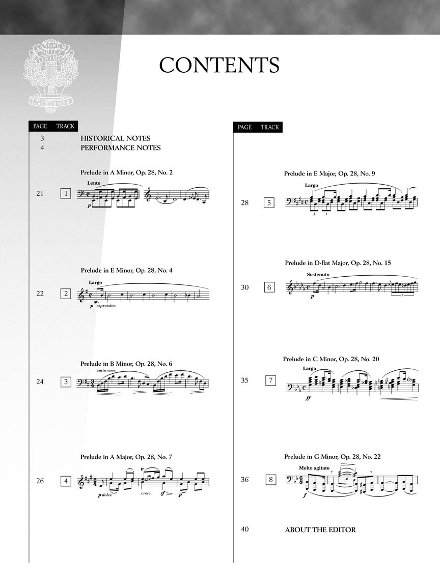 Prelude in A Minor, Op. 28, No. 2Prelude in E Minor, Op. 28, No. 4Prelude in B Minor, Op. 28, No. 6Prelude in A Major, Op. 28, No. 7Prelude in E Major, Op. 28, No. 9Prelude in D-flat Major, Op. 28, No. 15Prelude in C Minor, Op. 28, No. 20Prelude in G Minor, Op. 28, No. 22