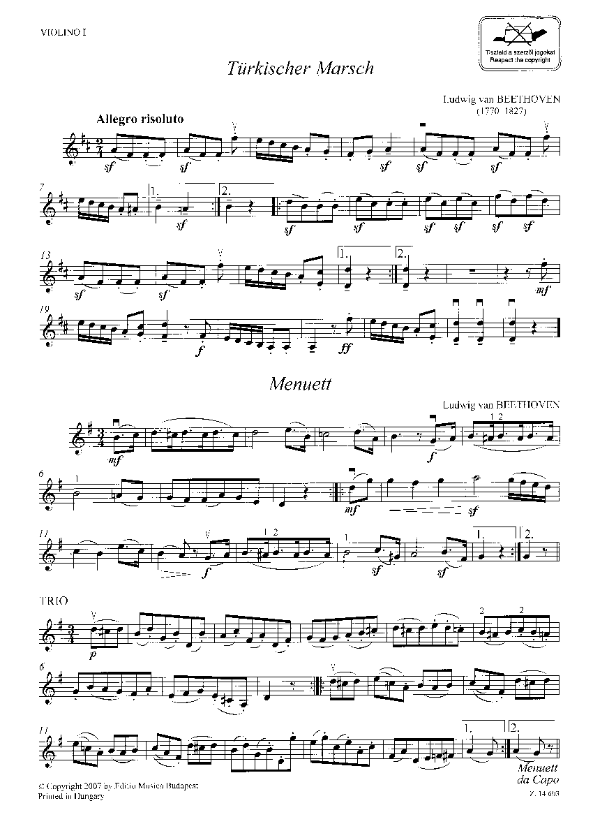 Türkischer Marsch (Beethoven)Menuett (Beethoven)Russischer Tanz (Beethoven&Wranitzky)Walzer (Beethoven)Kontretanz (Mozart)Kontretanz 2 (Mozart)4 Ungarische Tänze5 Cassationsstücke (Haydn)Trio (Haydn)Divertimento (Mozart)Minuetto militare (Bruni)Romanza e Rondo (Pleyel)