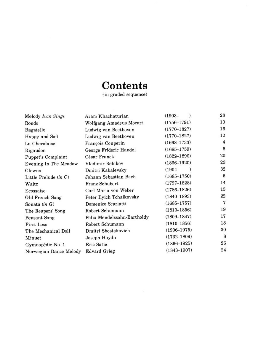 Melody-Ivan Sings (Khachaturian)Rondo (Mozart)Bagatelle (Beethoven)Happy and Sad (Beethoven)La Charolaise (Couperin)Rigaudon (Handel)Puppet's Complaint (Franck)Evening in the Meadow (Rebikov)Clowns (Kabalevsky)Little Prelude in C (Bach)Waltz (Schubert)Ecossaise (Weber)Old French Song (Tchaikovsky)Sonata in G (Scarlatti)The Reaper's Song (Schumann)Peasant Song (Mendelssohn-Bartholdy)First Loss (Schumann)The Mechanical Doll (Shostakovich)Minuet (Haydn)Gymnopedie No.1 (Satie)Norwegian Dance Melody (Grieg)