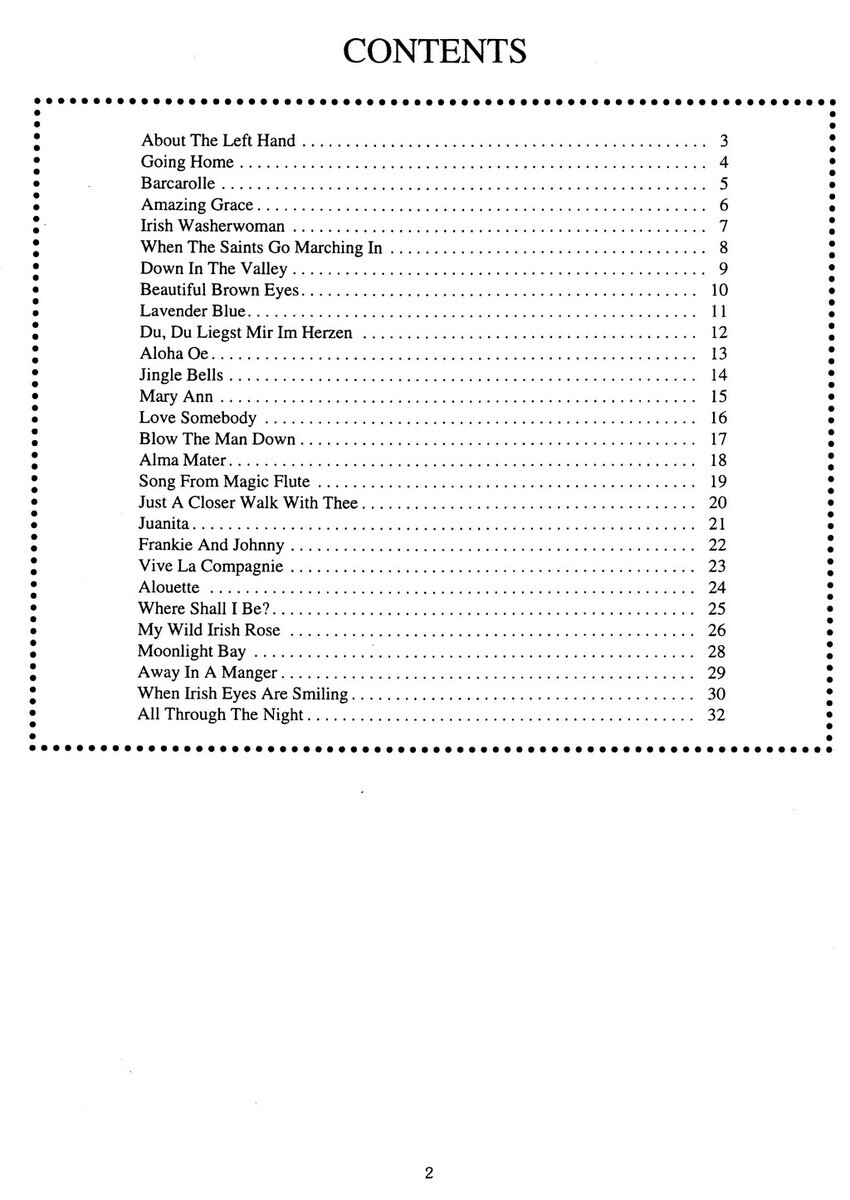 About the Left HandGoing HomeBarcarolleAmazing GraceIrish WasherwomanWhen the Saints Go Marching InDown in the ValleyBeautiful Brown EyesLavender BlueDu, Du Liegst Mir Im HerzenAloha OeJingle BellsMary AnnLove SomebodyBlow the Man DownAlma MaterSong From Magic FluteJust a Closer Walk with TheeJuanitaFrankie and JohnnyVive La CompagnieAlouetteWhere Shall I Be?My Wild Irish RoseMoonlight BayAway in a MangerWhen Irish Eyes are SmilingAll Through the Night