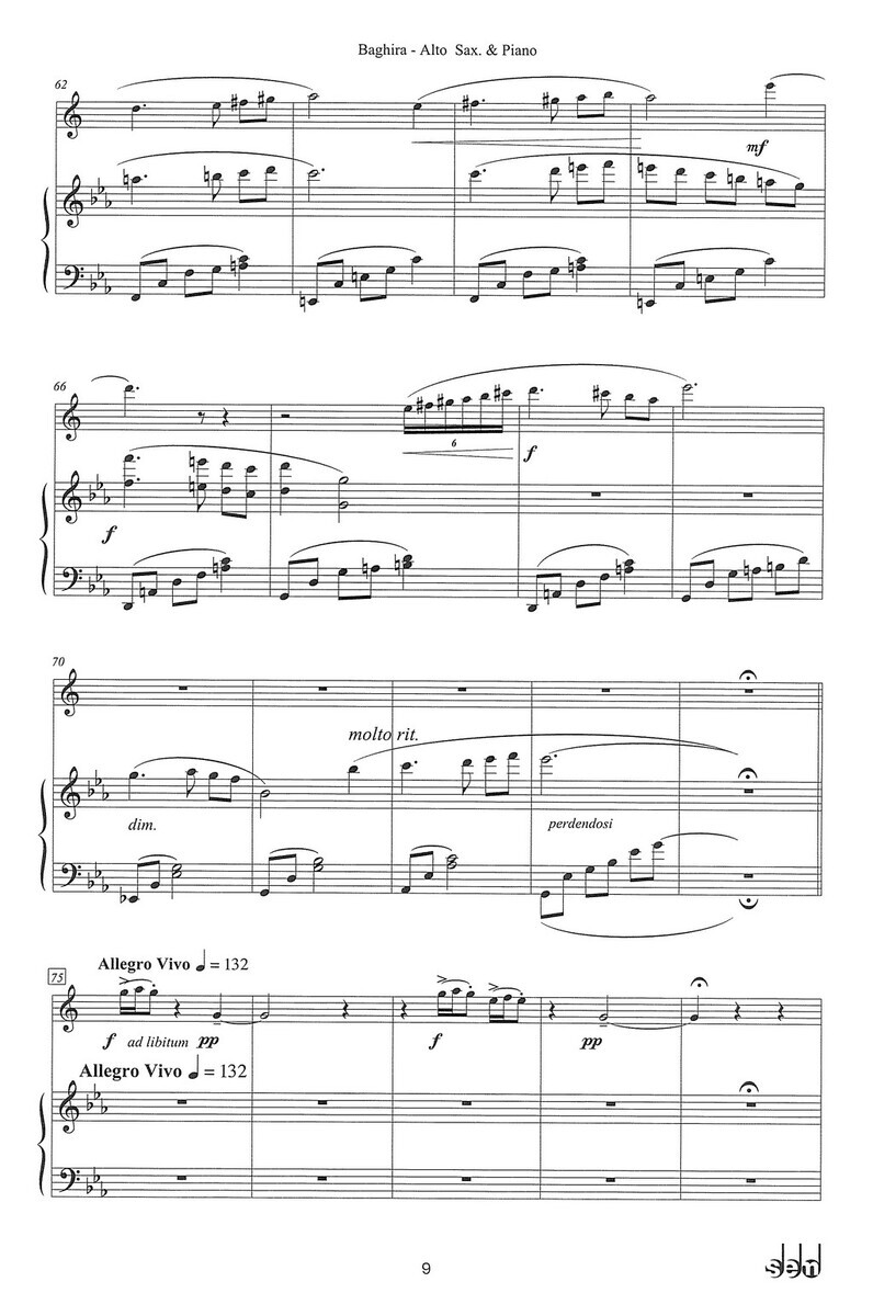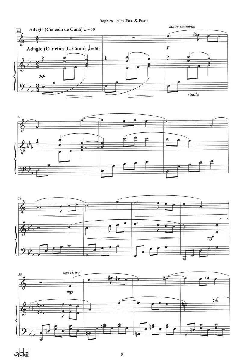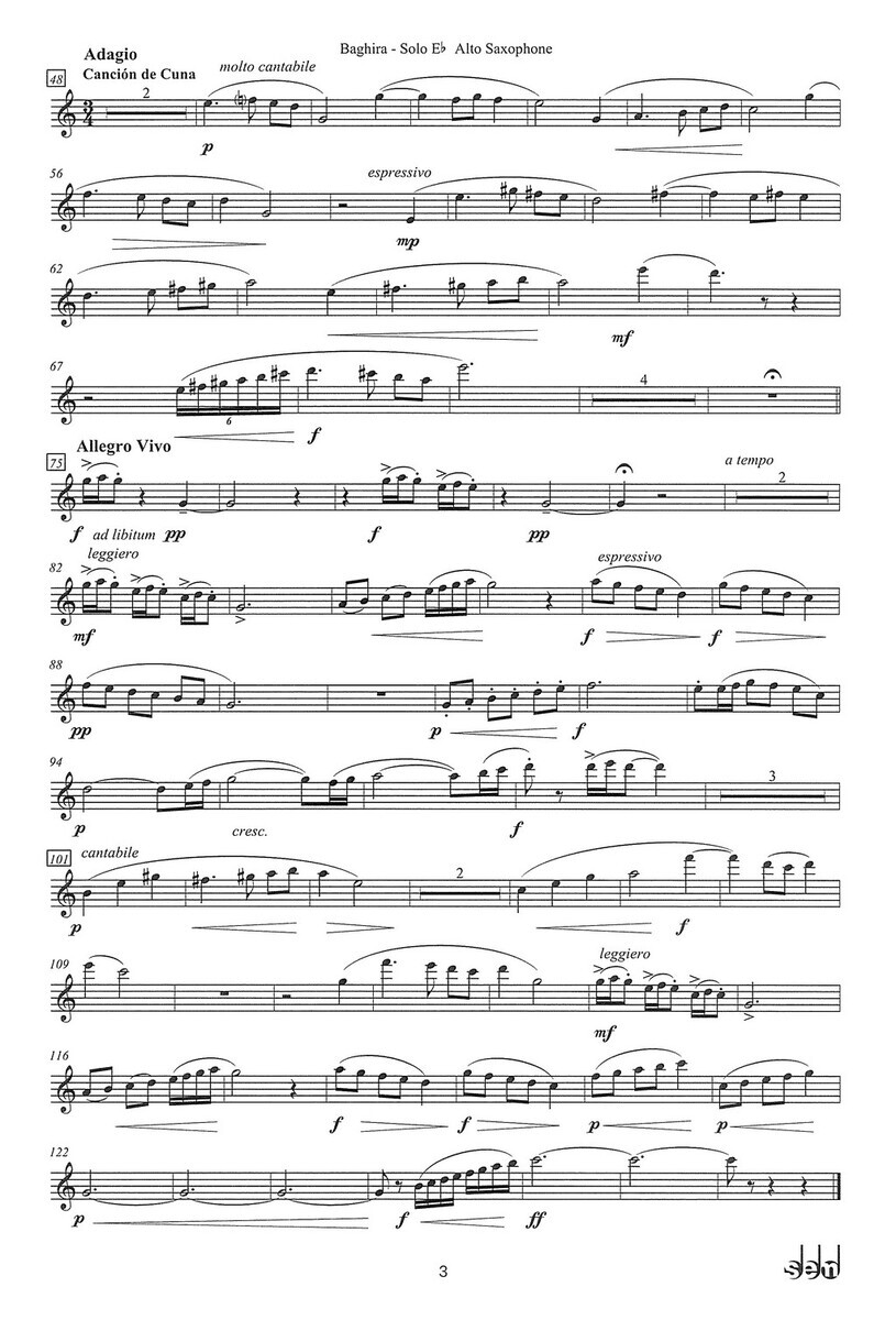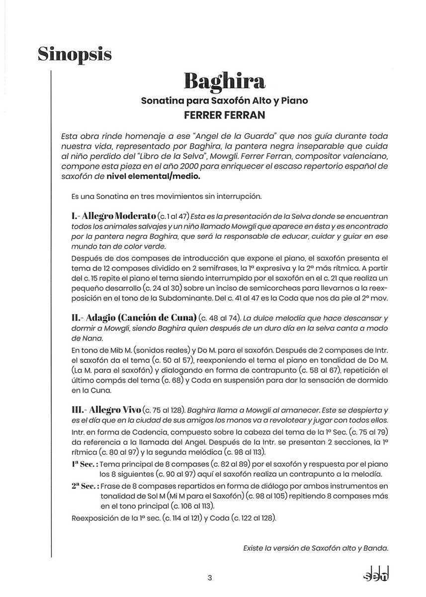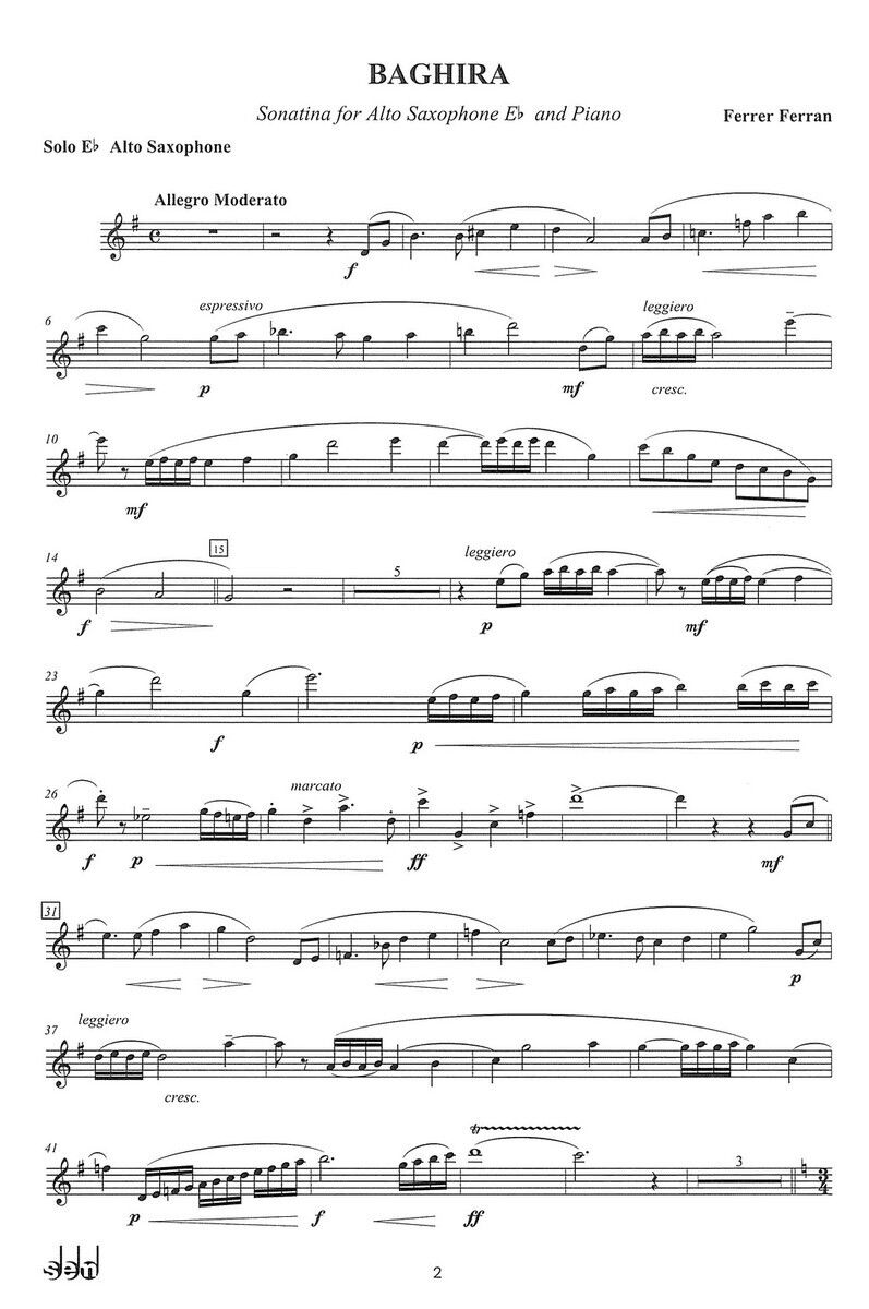 "Baghira" od Ferrera Ferrana je třívětá skladba pro altový saxofon a klavír. Dílo je pojmenováno po panterovi z Kiplingovy Knihy džunglí a nese v sobě jak noblesu a eleganci této literární postavy, tak i její vnitřní sílu a napětí. Hudebně se skladba vyznačuje bohatou dynamikou, kontrastem lyrických pasáží a virtuózních běhů, které dávají saxofonistovi příležitost ukázat technickou vyspělost i barevnou škálu tónu. Klavírní doprovod zde nefunguje pouze jako podpora, ale jako rovnocenný partner, který vytváří atmosféru a dramatický rámec celé skladby. Dílo je vhodné jak pro koncertní provedení, tak pro soutěžní vystoupení a ukazuje Ferranův cit pro moderní, přístupnou a posluchačsky atraktivní hudbu, která čerpá z tradice, ale směřuje k současnému výrazu.