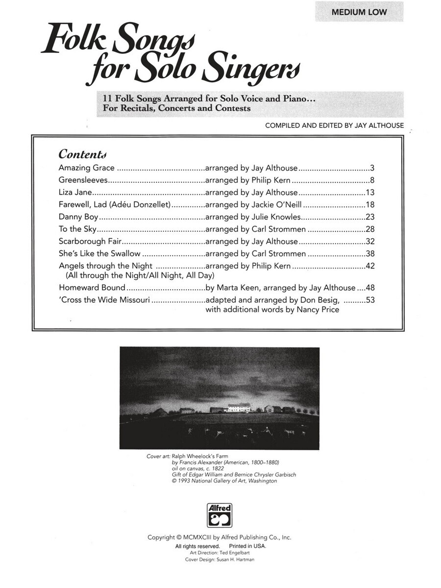 Tituly sérieAlfred's Vocal Solo Collections jsou neocenitelným zdrojem velmi různorodého pěveckého repertoáru pro všechny zpěváky a jejich učitele. Každý titul této série nabízí skvělý výběr pěveckých sól pro Vaše vystoupení, koncerty a soutěže. Tento titul Vám nabízí 11 velmi známých a oblíbených lidových písní profesionálně upravených pro sólový zpěv (středně nízký hlas - medium low) s doprovodem klavíru. Na přiloženém CD je nahrán klavírní doprovod k uvedeným skladbám.