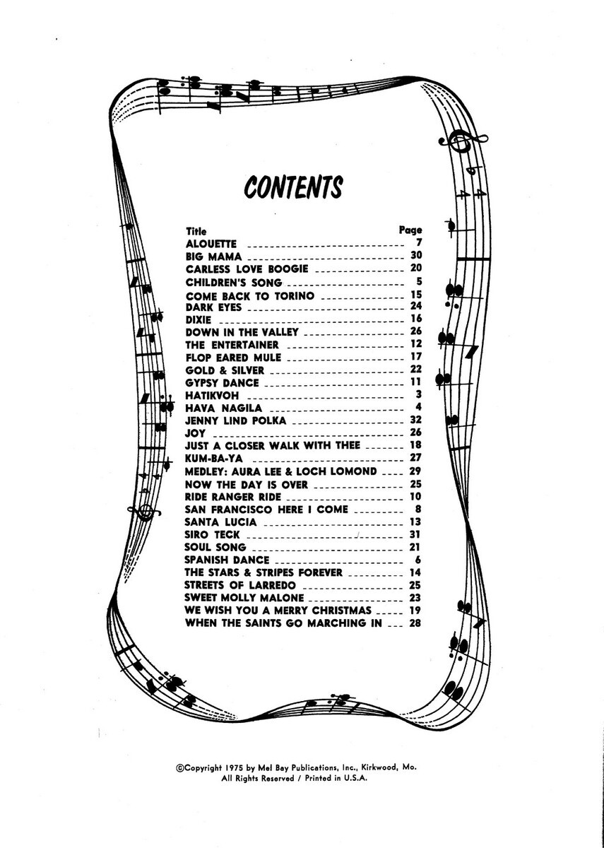 HatikvohHava NagilaChildren´s SongSpanish DanceAlouetteSan Francisco Here I ComeRide Ranger RideGypsy DanceThe EntertainerSanta LuciaThe Stars And Stripes ForeverCome Back To TorinoDixieFlop Eared MuleJust A Closer Walk With TheeWe Wish You A Merry ChristmasCareless Love BoogieSoul SongGold And SilverSweet Molly MaloneDark EyesStreets Of LarredoNow The Day Is OverJoyDown In The ValleyKum-Ba-YaWhen The Saints Go Marching InAura Lee And Loch Lomond-MedleyBig MamaSiro TeckJenny Lind Polka