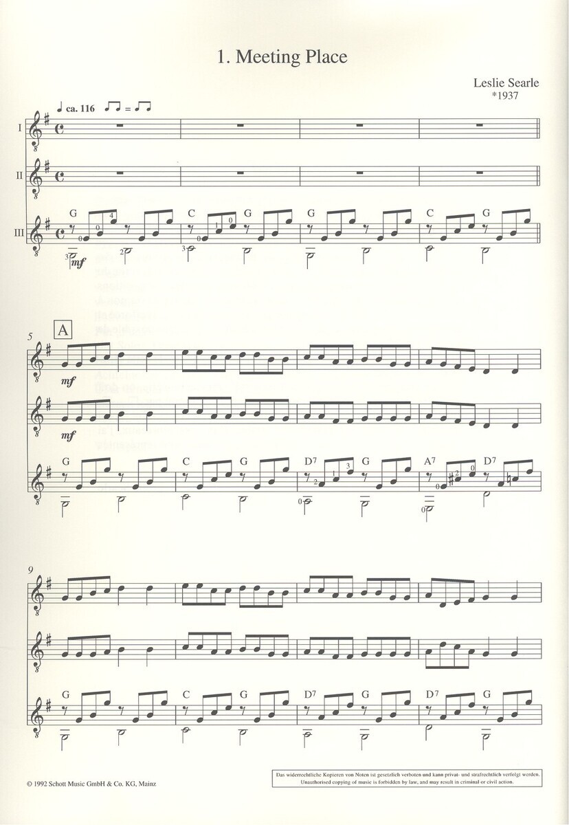 Zajímavý sešit, který Vám nabízí 15 originálních skladeb pro tři kytary od Leslie Searle. Celá tato kolekce skladeb je napsána s cílem naučit se hrát pro radost a pro zábavu, je v jednoduchém a dobře čitelném aranžmá a třetí hlas je navíc doplněn akordovými značkami. Zajímavé a příjemné!