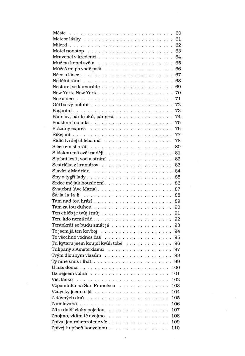 Alenka vříši divůAž na severní pól šel bych rádAž to se mnu sekneBeatlesBěž za svou láskouBlízko Little Big HornuBlues folsomské vězniceCesta rájemCo děláš, to dělej rádČas růžíČerný cikánĎáblovo stádoDajánaDáša jedla cukrovíDědečkův duchDej mi pár okovůDík nápadůmDiskohrátkyDominikuDotazníkEldoradoFůra chybHolky já mám všechny rádChci tě líbatChci zapomenoutChtěl bych být medvídkemJá mám ráda boogieJá tizabrnkámJahodový koktejlJdi zaštěstímJen se hádejJe ráno AnnoJinak to nejdeKateřinaKaždý jednou velkou lásku potkáKde jsiKdo vchází do tvých snůKdybych já byl kovážemKdyž náš táta hrálKdyž se narodímeKdyž zabloudíš tak zavolejKoncert bez plakátůKrálovna bielych tenisiekKrinolínaKonec ptáčích áriíLéta letíLéto jak má býtLupič WillyMademoiselle GisseleMálo mě znáMěsícMeteor láskyMilordMotel nonstopMravenci v kredenciMuž na konci světaMůžeš mi po vodě psátNěco o lásceNedělní ránoNestarej se kamarádeNew York, New YorkNoc a denOči barvy holubíPaganiniPár slov, pár kroků, pár gestPodzimní náladaprázdný expresŘíkej miŘidič tvrdej chleba máSčertem si hrátS láskou má svět nadějiS písní lesů, vod a stráníSestrička z kramárovSlavíci z MadriduSny o tygří ladySrdce mé jak housle zníSvatebníŠa-la-la-la-liTam nad tou hrázíTam za tou duhouTen chléb je tvůj i můjTen, kdo nemá rádTentokrát se budu smát jáTo jsem já ten kovbojTo všechno vodnes časTu kytaru jsem koupil kvůli toběTulipány z AmsterdamuTvým dlouhým vlasůmTy mně smíš i lhátU nás domaUž nejsem volnáVíš, láskoVzpomínka na San FranciscoVždycky jsem to jáZ dávných dnůZamilovanáZítra další vlaky pojedouZnojmo, vidím tě dvojmoZpíval jen rokenrol nic vícZpívej tu píseň kouzelnou