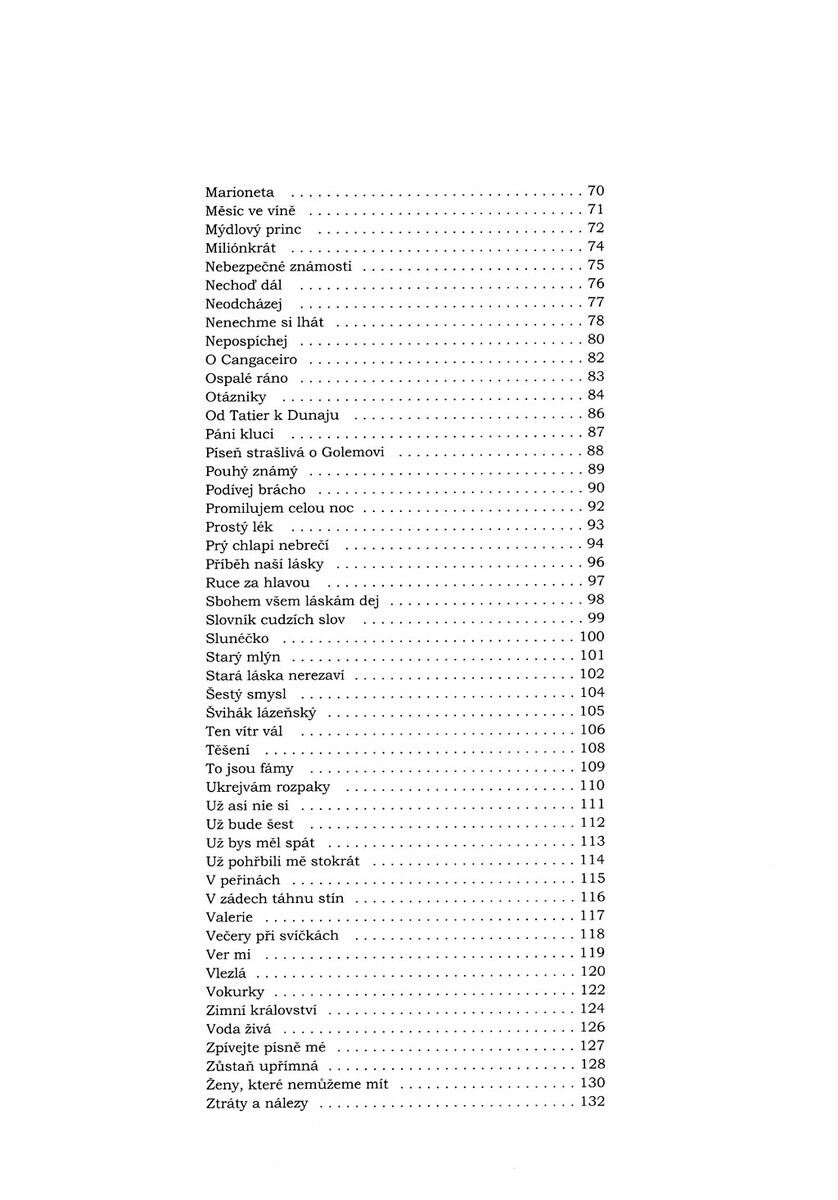 1970900 milA - BA svět se líně točí dálAbsolutní ženaAndělBessieBuď sbohemBezchybnáČert ví pročCestaČím to jeDám si tě klonovatDivocí koněDo starých známých místDívka GloriaDuj duj dujDveře do pokojeDocela obyčejná píseňFrancouzHáj modřínůHej rup! ChcemežítHned zítra ráno zavolámHop a je tu lidoopHráčHurikánChybí mi ta jistotaHvězdy nad BrnemJá si vsadil na pár tónůJá tam bylJackova píseňJe jaká jeJen se s písničkou smátJeště že tě lásko mámJsiKam se lásky podějíKámoš CampbellKdo to tu hvízdáKdyž jdou na mužskýho létaKdyž ji potkášKdyž písně lžouKokočíKousek cesty s teb ouKdyž nám bývalo šestnáctKočovní herciLáska je ďábelLáska je počasíLáskopádLegendyLeknáMarionetaMěsíc ve víněMýdlový princMiliónkrátNebezpečné známostiNechoď dálNeodcházejNenechme si lhátNepospíchejO CangaceiroOspalé ránoOtazníkyOd Tatier k DunajuPáni kluciPíseň strašlivá o GolemoviPouhý známýPodívej bráchoPromilujem celou nocProstý lékPrý chlapi nebrečíPříběh naší láskyRuce za hlavouSbohem všem láskám dejSlovník cudzích slovSlunéčkoStarý mlýnStará láska nerezavíŠestý smyslŠvihák lázeňskýTen vítr válTěšeníTo jsou fámyUkrejvám rozpakyUž asi nie siUž bude šestUž bys měl spátUž pohřbili mě stokrátV peřináchV zádech táhnu stínValerieVečery při svíčkáchVer miVlezláVokurkyZimní královstvíVodaživáZpívejte písně méZůstaň upřímnáŽeny, které nemůžeme mítZtráty a nálezy