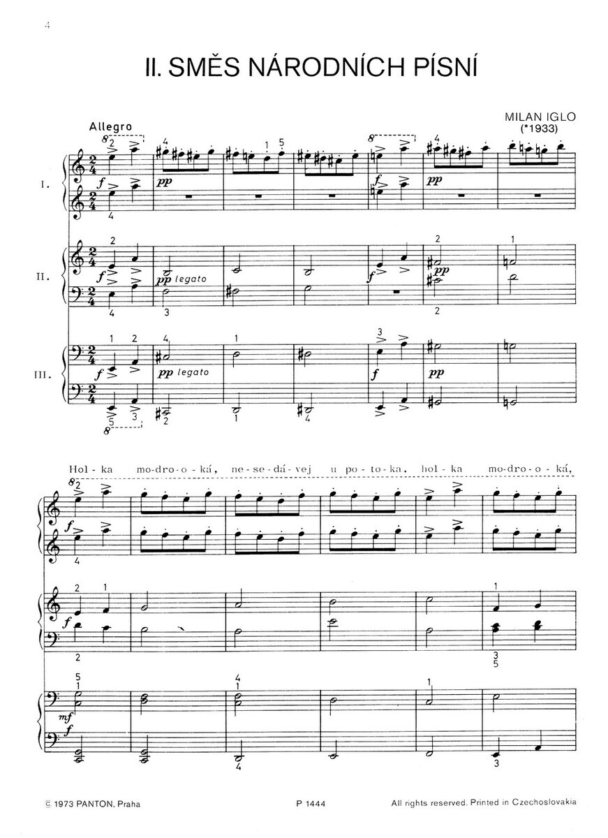 Milan Iglo (1933) -český skladatel a učitel.Studoval skladbu u Emila Hlobila na pražské konzervatoři (1955–58) a Hudební fakultu AMU u Pavla Bořkovce (1958–62).Je autorem mnoha instruktivních, sborových, klavírních, komorních i orchestrálních skladeb. Tento sešit Vám přináší jeho směs národních písní v úpravě pro jedno piano a šest rukou. Chcete-li si zahrát něco opravdu zajímavého, nestandardního (kanón, kde všechny hlasy hrají kousek za sebou nebo v každém hlasu jiná písnička), ale zároveň příjemného a jednoduchého, pak je tento sešit určen právě Vám !!! Obtížnost 2+