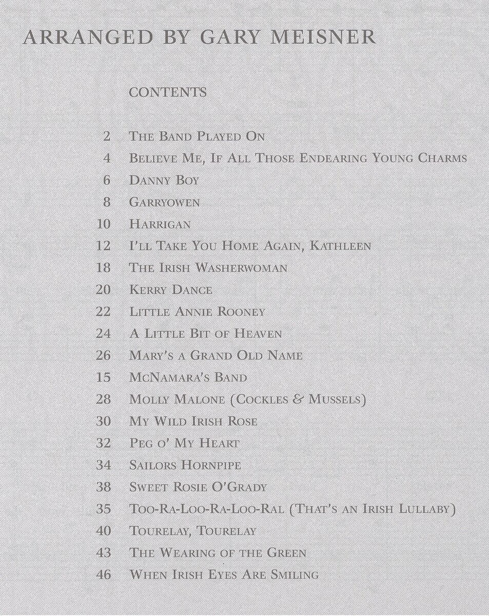 A Little Bit Of HeavenBelieve Me, If All Those Endearing Young CharmsDanny BoyGarryowenHarriganI'll Take You Home Again, KathleenKerry DanceLittle Annie RooneyMary's A Grand Old NameMcNamara's BandMolly Malone (Cockles& Mussels)My Wild Irish RosePeg O' My HeartSailors HornpipeSweet Rosie O'GradyThe Band Played OnThe Irish WasherwomanThe Wearing Of The GreenToo-Ra-Loo-Ra-Loo-Ral (That's An Irish Lullaby)Tourelay, TourelayWhen Irish Eyes Are Smiling