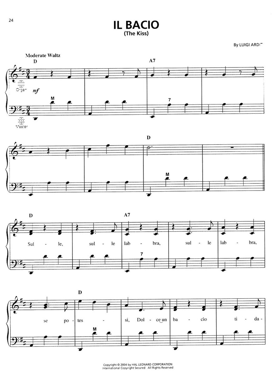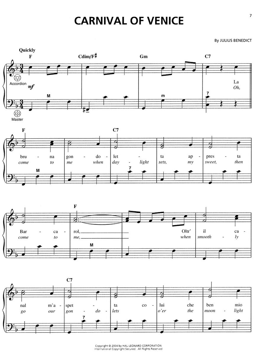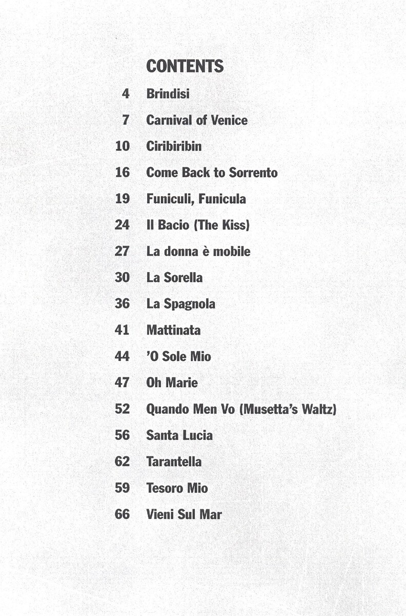 'O Sole MioBrindisi (Libiamo)Carnival Of VeniceCiribiribinCome Back To SorrentoFuniculi, FuniculaIl Bacio (The Kiss)La SorellaLa SpagnolaLa donna e mobileMattinataOh MarieQuando Men Vo (Mussetta's Waltz)Santa LuciaTarantellaTesoro MioVieni Sul Mar