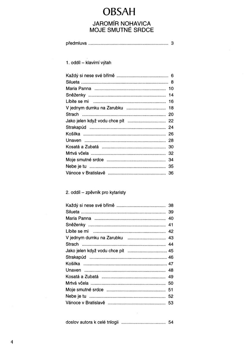 Jaromír Nohavica (1953) je přední český folkový písničkář, textař, osobitý zpěvák, skladatel a kytarista. Tento zpěvník obsahuje písně z jeho CD Moje smutné srdce (2000). TItul je rozdělen do dvou částí, první část je ve standardní úpravě piano/vocal/chord, tedy melodická linka s textem, akordové značky a klavírní part, druhá část obsahuje stejné skladby pouze v úpravě text a akordové značky.