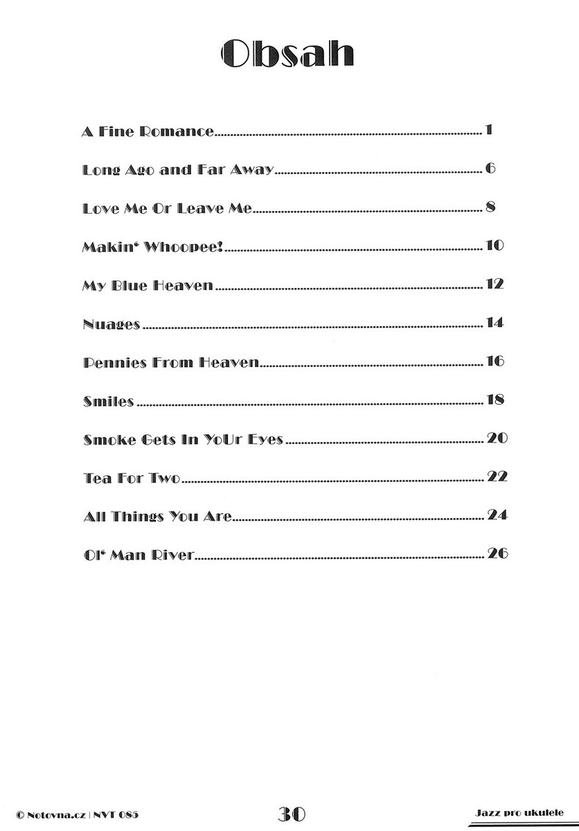 „Jazz pro ukulele“ nabízí hráčům na ukulele výběr dvanácti slavných jazzových standardů, které se zapsaly do zlatého fondu světové populární hudby.  Aranžmá jsou určena pro sólové ukulele bez zpěvu, s přehledně vyznačenými akordickými značkami nad notovým zápisem a tabulaturou. Díky akordům je možné skladby doprovodit dalšími nástroji nebo využít jako základ pro improvizaci.  Úpravy jsou koncipovány pro mírně pokročilé až pokročilé hráče a kladou důraz na hudební výraz, stylovou čistotu a technickou přístupnost.