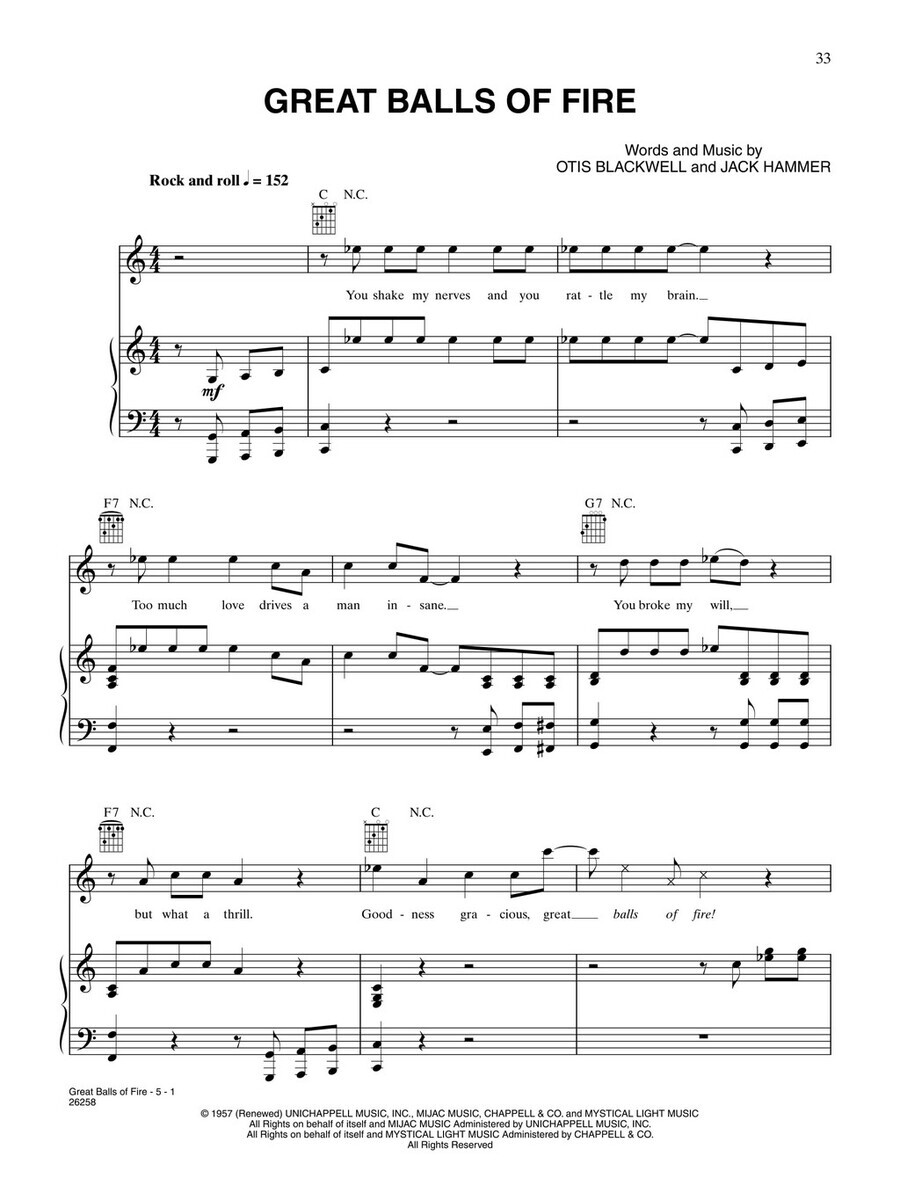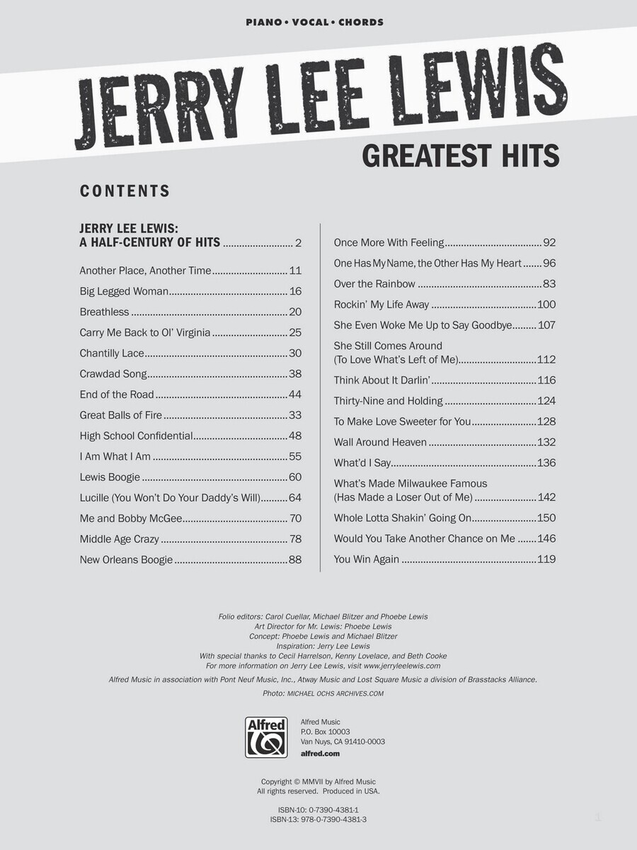 Jerry Lee Lewis (1935) - legendární americký rokenrolový zpěvák, klavírista a skladatel, který byl v roce 1986 uveden do rokenrolové síně slávy a hudební časopis Rolling Stone Magazine ho zařadil na 24 místo v žebříčku 100 největších osobností populární hudby všech dob. Tento titul Vám přináší sbírku 30 jeho největších hitů v úpravě piano/vocal/guitar tedy melodická linka s textem, kytarové akordové značky a klavirní part. V sešitě naleznete také několika stránkové povídání o jeho životě. Zajímavý titul !!!
