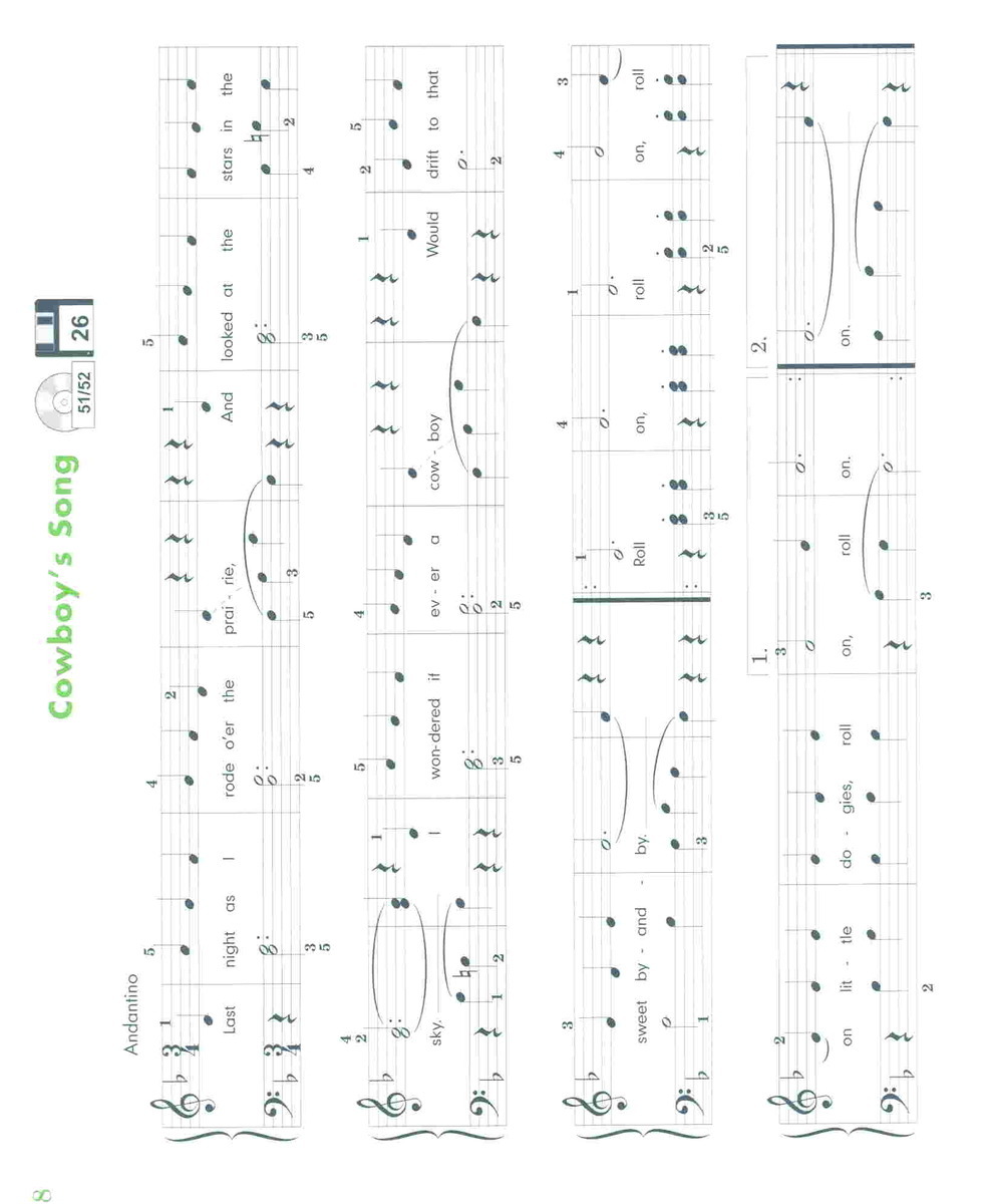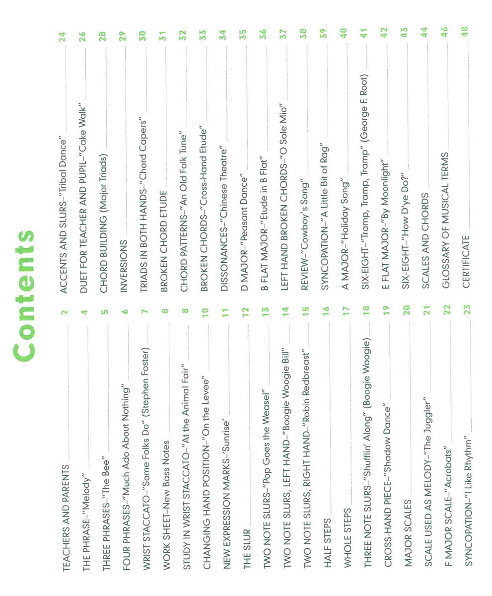 MelodyThe BeeMuch Ado About NothingSome Folks DoAt the Animal FairOn the LeveeSunrisePop Goes the WeaselBoogie Woogie BillRobin RedbreastShufflin' AlongShadow DanceThe JugglerAcrobatsI Like RhythmTribal DanceCake WalkChord CapersAn Old Folk TuneCross-Hand EtudeChinese TheatrePeasant DanceEtude in B flatO Sole MioCowboy's SongA Little Bit of RagHoliday SongTramp, Tramp, TrampBy MoonlightHow D'ye Do?