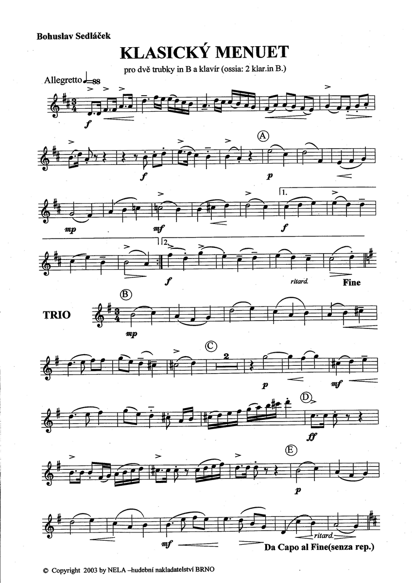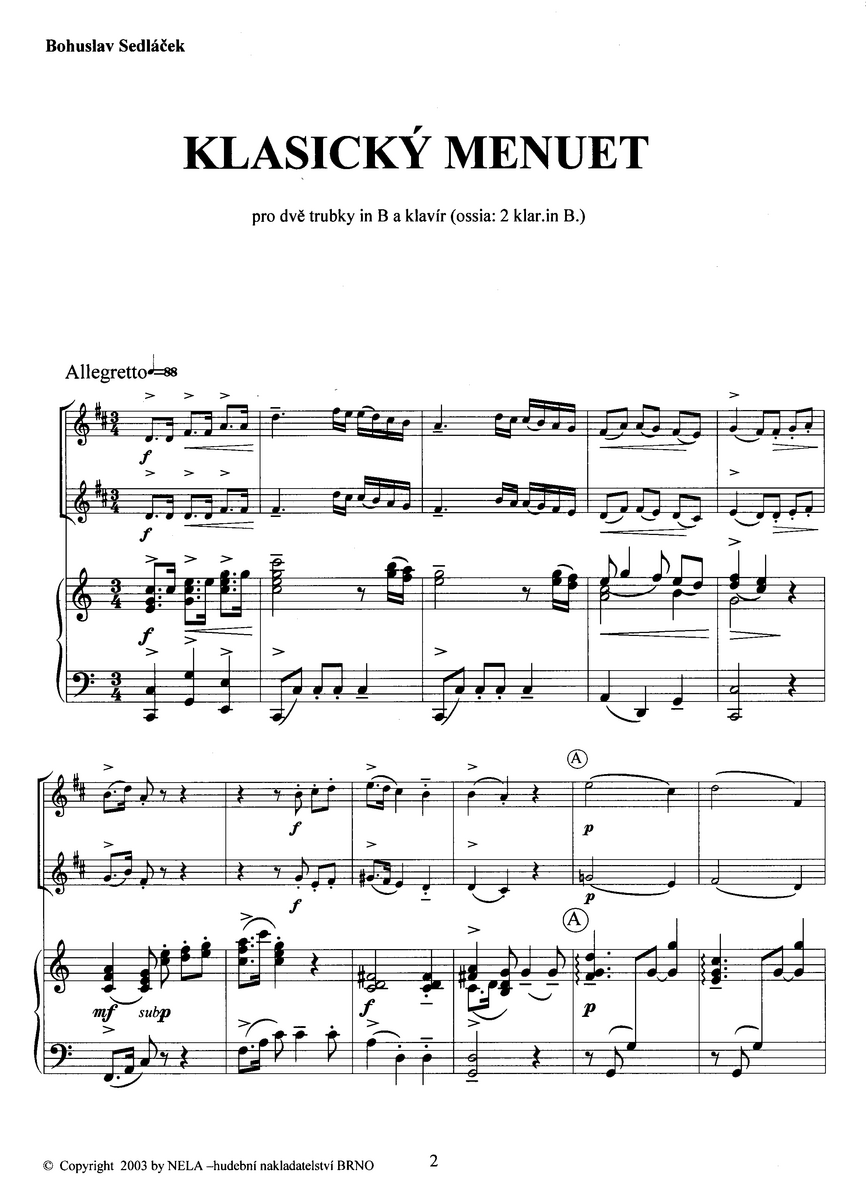 Sešit nabízející dvě skladby pro dva nástroje ladění B (trumpeta, klarinet, tenor sax) s doprovodem klavíru. Klasický Menuet, originální skladba od Bohuslava Sedláčka a také v jeho úpravě lidovou píseň MORAVO, MORAVO. Titul obsahuje klavírní doprovod plus dva samostatné party pro jednotlivé nástroje.