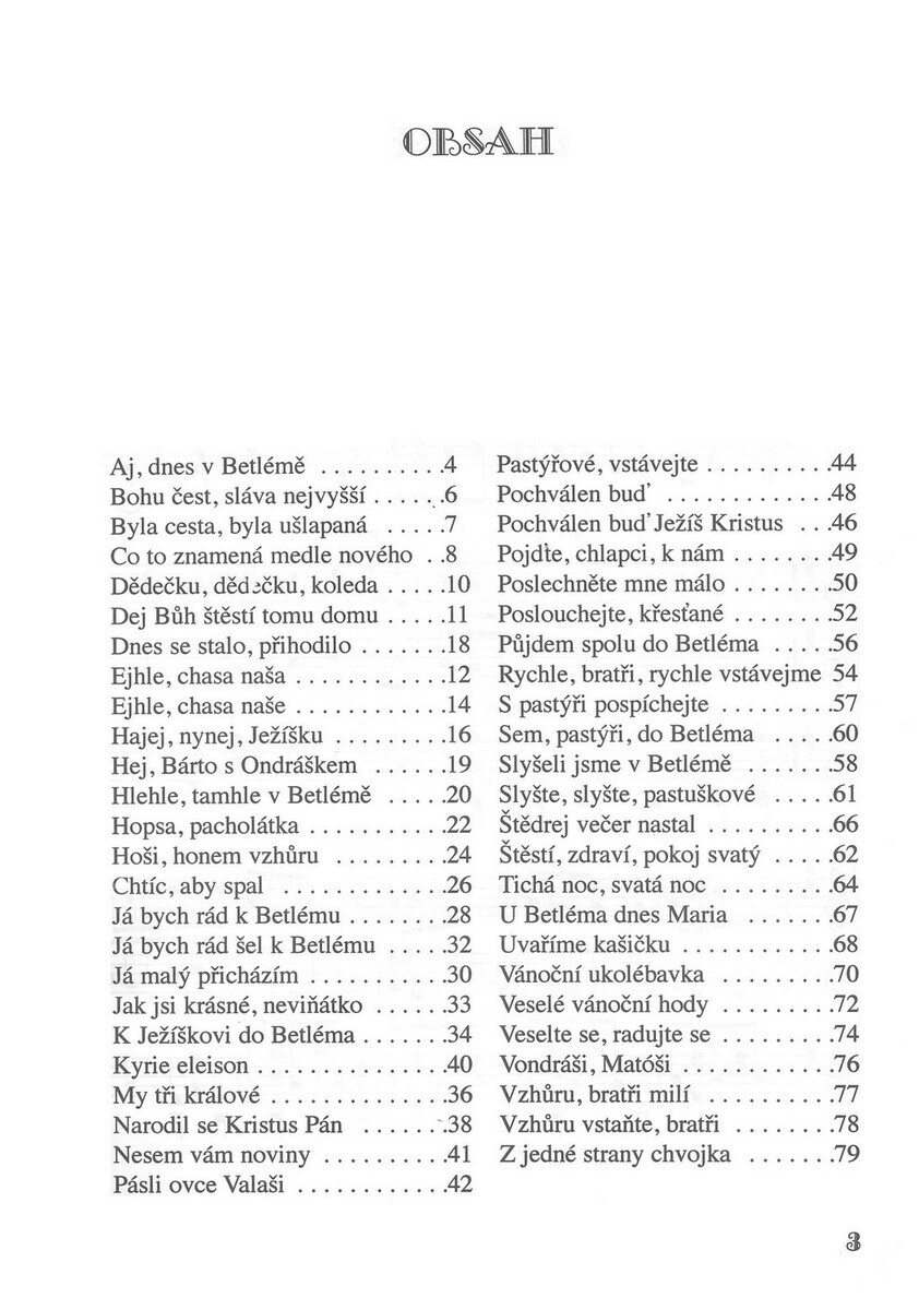 Aj, dnes v BetléměBohučest, sláva nejvyššíByla cesta, byla ušlapanáCo to znamená medle novéhoDědečku, dědečku, koledaDej Bůh štěstí tomu domuDnes se stalo, přihodiloEjhle, chasa našaEjhle, chasa našeHajej, nynej, JežíškuHej, Bárto s OndráškemHlehle, tamhle v BetléměHopsa, pacholátkaHoši, honem vzhůruChcíc, aby spalJá bych rád k BetlémuJá bych rád šel k BetlémuJá malý přicházímJak jsi krásné, neviňátkoK Ježíškovi do BetlémaKyrie eleisonMy tři královéNarodil se Kristus PánNesem vám novinyPásli ovce ValašiPastýřové, vstávejtePochválen buďPochválen buď Ježíš KristusPojďte, chlapci, k námPoslechněte mne máloPoslouchejte, křesťanéPůkdem spolu do BetlémaRychle, bratři, rychlé vstávejteS pastýři pospíchejteSem, pastýři, do BetlémaSlyšeli jsme v BetléměSlyšte, slyšte, pastuškovéŠtědrej večer nastalŠtěstí, zdraví, pokoj svatýTichá noc, svatá nocU Betléma dnes MariaUvaříme kašičkuVánoční ukolébavkaVeselé vánoční hodyVeselte se, radujte seVondráši, MatóšiVzhůru, bratři milíVzhůru vstaňte, bratřiU jedné strany chvojka