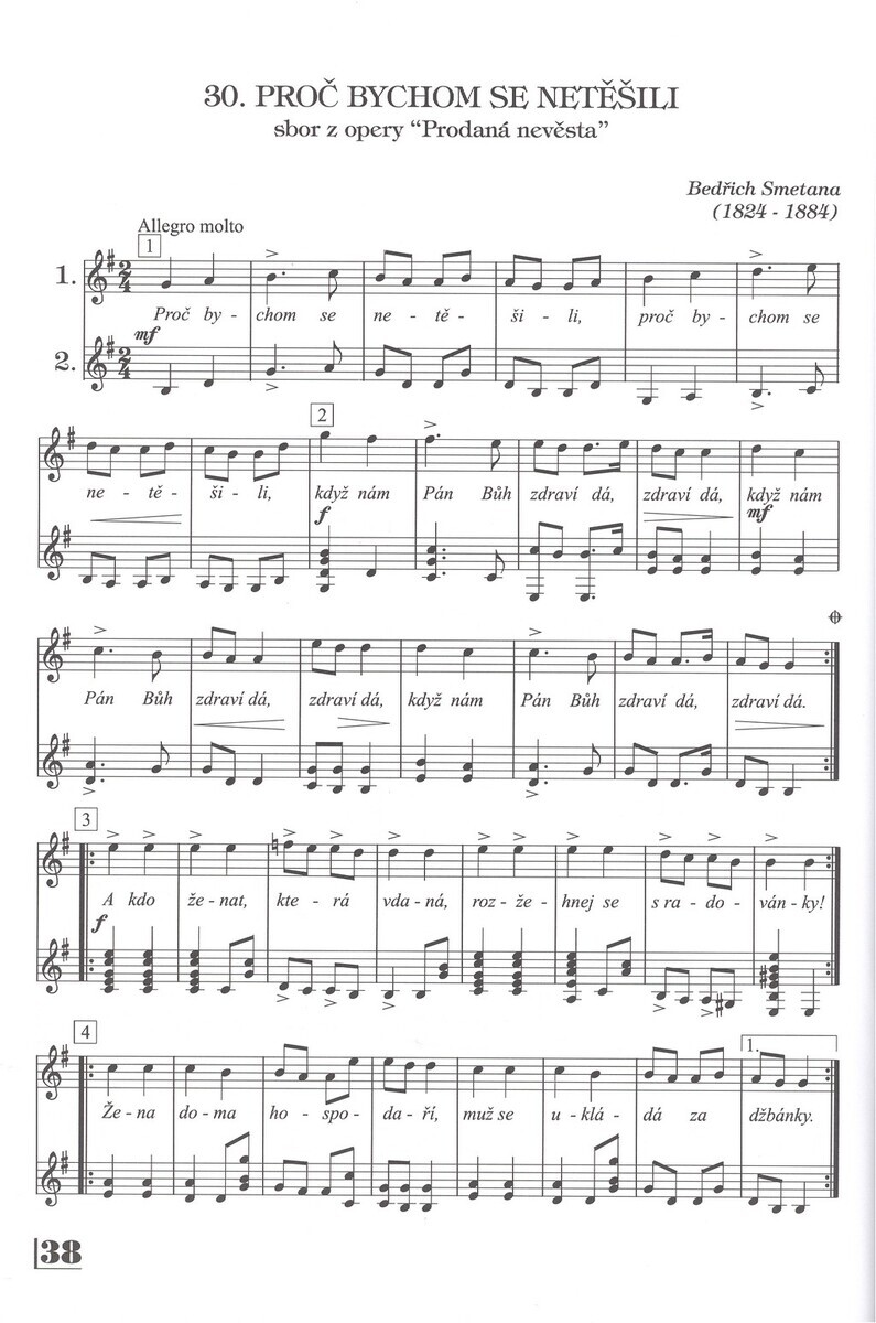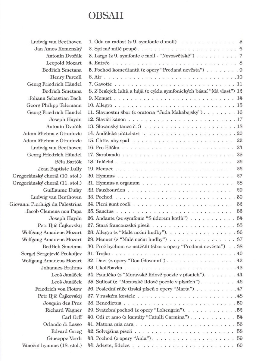 Óda na radost (L.van Beethoven)Spi mé milé poupě (J.A.Komenský)Largo z 9. symf. e moll-Novosvětské (A.Dvořák)Entrée (L.Mozart)Pochod komediantů (B.Smetana)Air (H.Purcell)Gavotte (G.F.Händel)Zčeských luhů a hájů (B.Smetana)Menuet (J.S.Bach)Allegro (G.P.Telemann)Slavnostní sbor (G.F.Händel)Slavičí kanon (J.Haydn)Slovanský tanec č.3 (A.Dvořák)Andělské přátelství (Adam Michna z Otradovic)Chtíc, aby spal (Adam Michna z Otradovic)Pro Elišku (L.van Beethoven)Sarabanda (G.F.Händel)Tulácká (B.Bartók)Menuet (J.B.Lully)HymnusHymnus a organumFauxbourdon (G.Dufay)Yorckscher Marsch (L.van Beethoven)Pleni sunt coeli (G.P.da Palastrina)Sanctus (J.C.non Papa)Andante ze symf. Súderem kotlů (J.Haydn)Stará francouzská píseň (P.I.Čajkovskij)Allegro z Malé noční hudby (W.A.Mozart)Menuet z Malé noční hudby (W.A.Mozart)Proč bychom se netěšili (B.Smetana)Trojka (S.Prokofjev)Duet z opery Don Giovanni (W.A.Mozart)Ukolébavka (J.Brahms)Psaníčko (L.Janáček)Stálosť (L.Janáček)Poslení růže z opery Marta (F.von Flotow)V ruském kostele (P.I.Čajkovskij)Benedictus (J.des Prez)Svatební pochod z opery Lohengrin (R.Wagner)Odi et amo (C.Orff)Matona mia cara (O.di Lasso)Solvejžina píseň (E.Grieg)Pochod z opery Aida (G.Verdi)Adeste, fideles