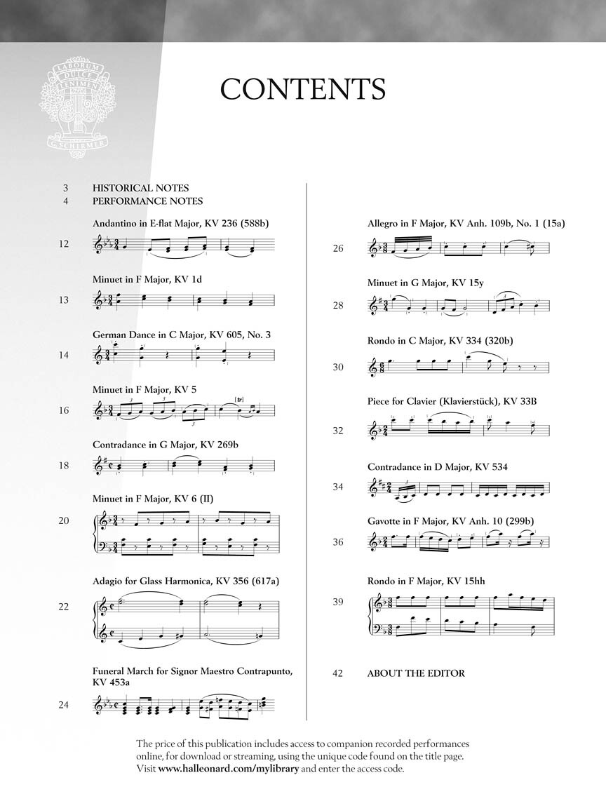Andantino in E-flat Major, KV 236 (588b) (W.A. Mozart)Minuet in F Major, KV 1d (W.A. Mozart)German Dance in C Major, KV 605, No. 3 (W.A. Mozart)Minuet in F Major, KV 5 (W.A. Mozart)Contradance in G Major, KV 269b (W.A. Mozart)Minuet in F Major, KV 6 (W.A. Mozart)Adagio for Glass Harmonica, KV 356 (617a) (W.A. Mozart)Funeral March for Signor Maestro Contrapunto, KV 453a (W.A. Mozart)Allegro in F Major, KV Anh. 109b, No. 1 (15a) (W.A. Mozart)Minuet in G Major, KV 15y (W.A. Mozart)Rondo in C Major, KV 334 (320b) (W.A. Mozart)Piece for Clavier (Klavierstück), KV 33B (W.A. Mozart)Contradance in D Major, KV 534 (W.A. Mozart)Gavotte in F Major, KV Anh. 10 (299b) (W.A. Mozart)Rondo in F Major, KV 15hh (W.A. Mozart)