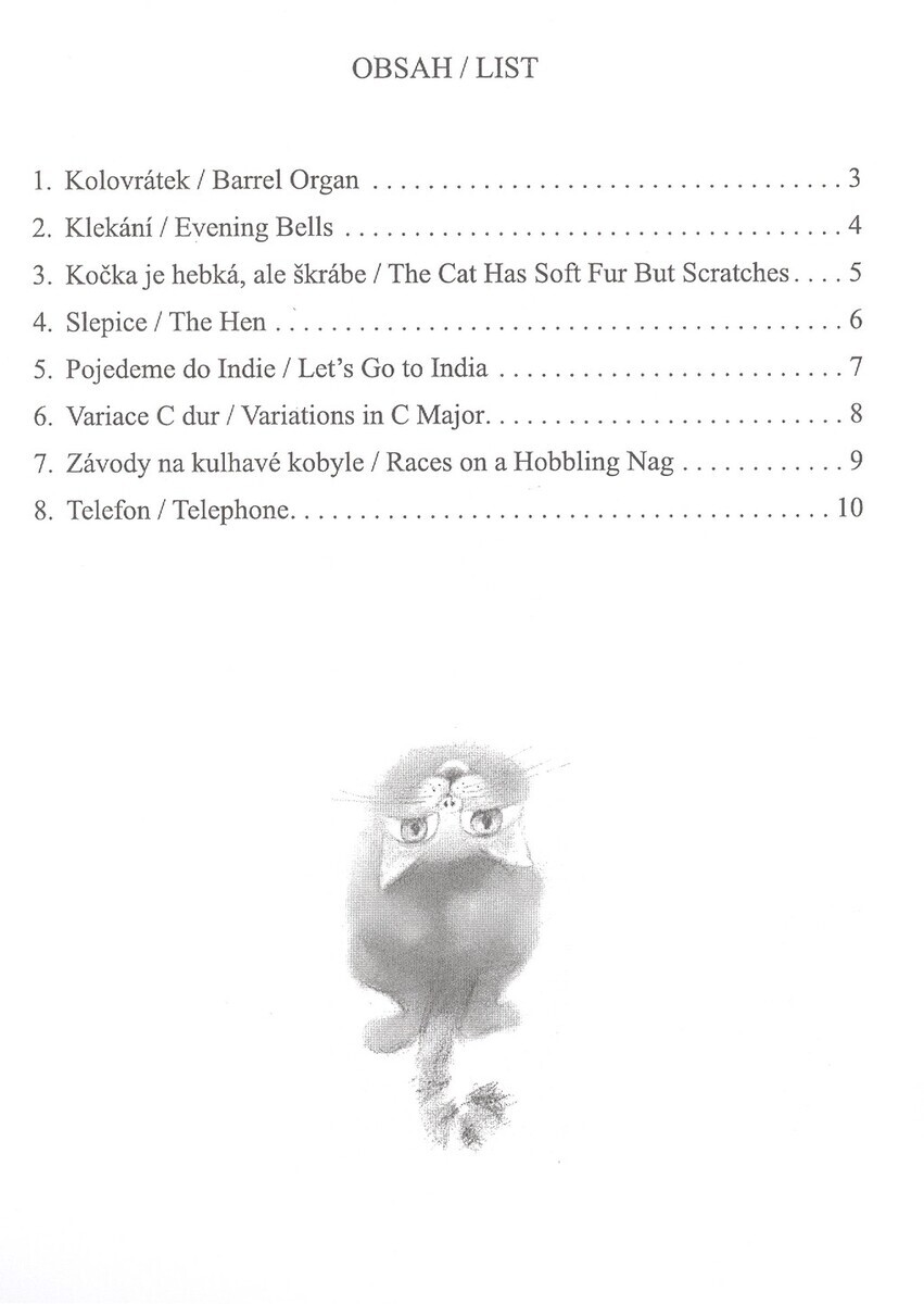 Kolovrátek / Barrel OrganKlekání / Evening BellsKočka je hebka, ale škrábe / The Cat Has Soft Fur But ScratchesSlepice / The HenPojedeme do Indie / Let´s Go to IndiaVaricace C dur / Variations in C MajorZávody na kulhavé kobyle / Races on a Hobbling NagTelefon / Telephone