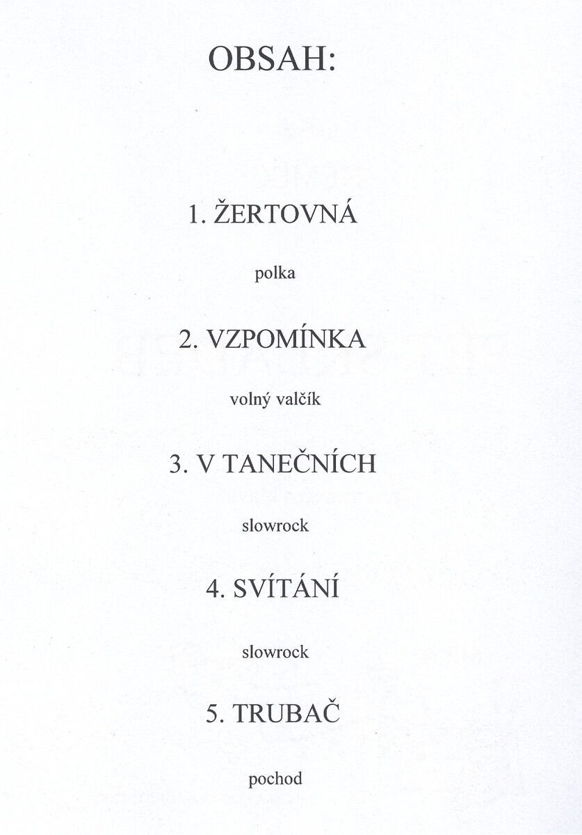 Polka -ŽertovnáVolný valčík - VzpomínkaSlowrock - V tanečníchSlowfox - SvítáníPochod - Trubač