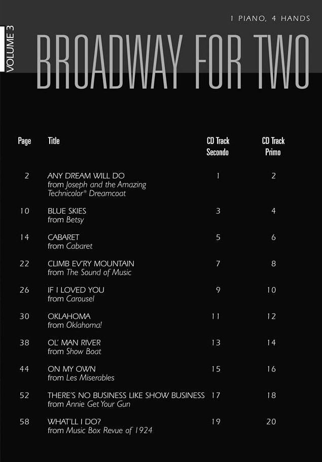 Any Dream Will Do (Joseph and the Amazing)Blue Skies (Betsy)Cabaret (Cabaret)Climb Ev'ry Mountain (The Sound of Music)If I Loved You (Carousel)Oklahoma (Oklahoma !)Ol' Man River (Show Boat)On My Own (Les Miserables)There's No Business Like Show Business (Annie Get Your Gun)What'll I Do? (Music Box Revue of 1924)