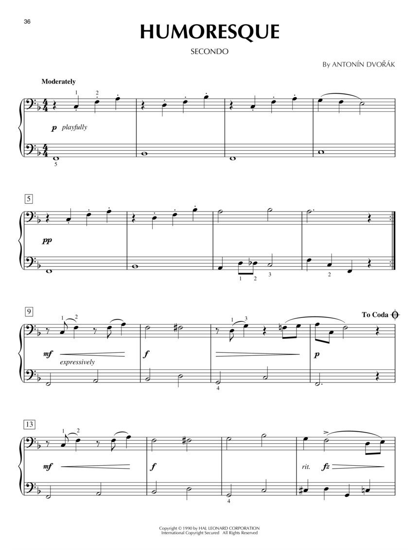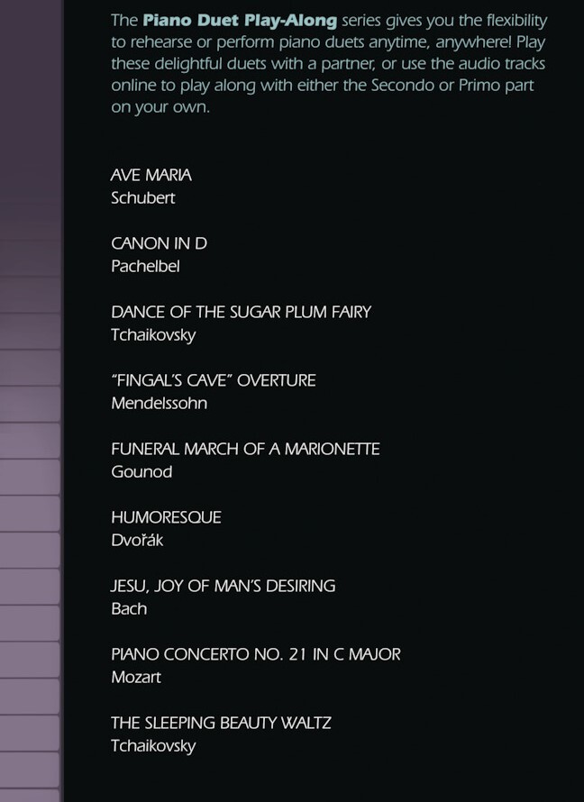 Nová a výborná série klavírních duet, která je navíc doplněna o CD, na kterém jsou nahrány oba hlasy (primo a secondo) samostatně a oba klavíristé tak mohou cvičit každý zvlášť a sejít se až těsně před vystoupením nebo můžete také hrát sólo piano s doprovodem druhého hlasu s CD. Navíc je na CD přiložen program, který Vám umožní měnit tempo skladby při přehrávání CD na počítači a přizpůsobit tak rychlost skladby Vašim možnostem a to v obou směrech. Uvedené náslechy obsahují pouze ukázky prvního (primo) hlasu. Povedené !!!