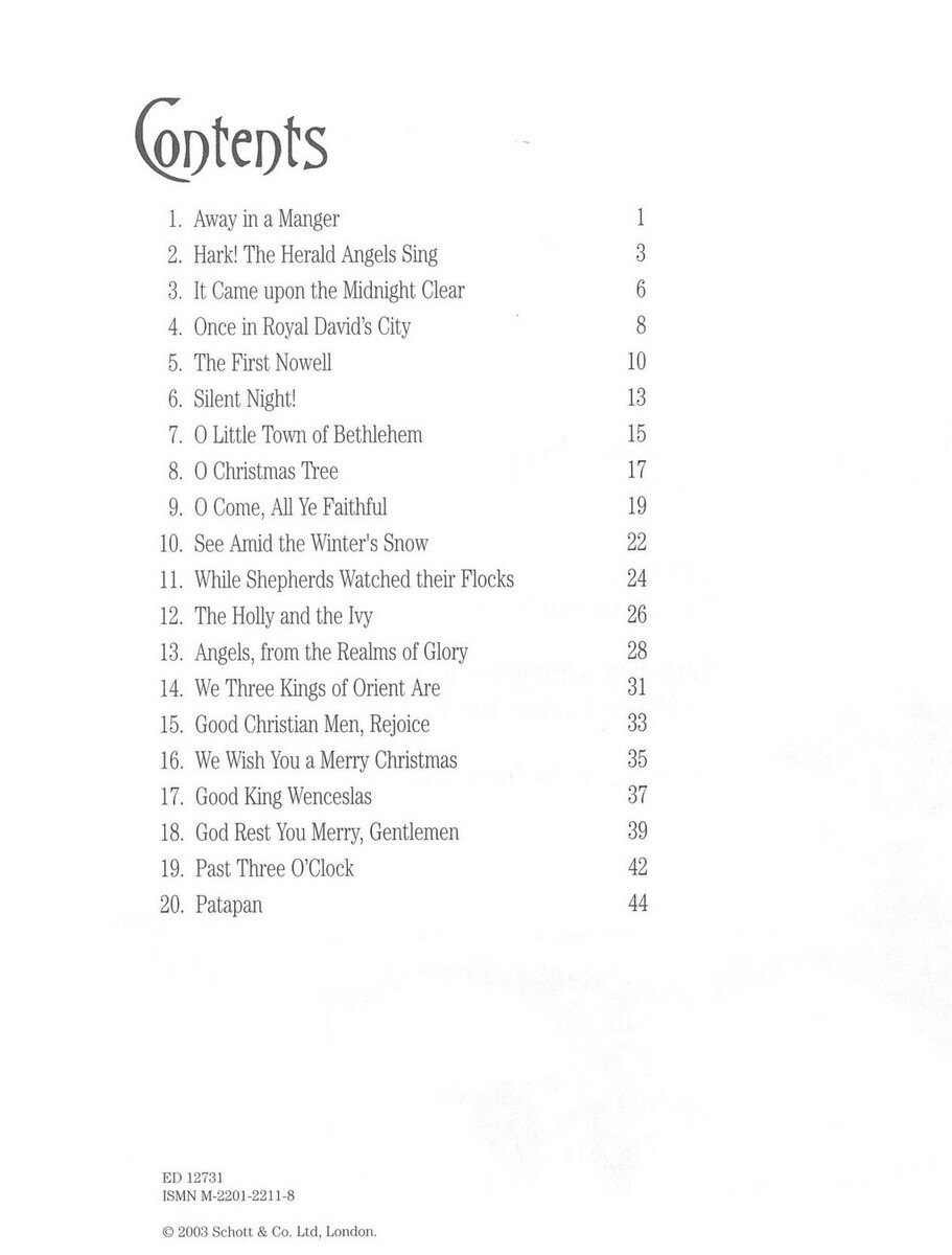 Away in a MangerHark! The Herald Angels SingIt came upon the Midnight ClearOnce in Royal David's CityThe First NowellSilent Night!O Little Town of BethlehemO Christmas TreeO Come, All Ye FaithfulSee Amid the Winter's SnowWhile Shepherds Watched Their FlocksThe Holly and the IvyAngels, from the Realms of GloryWe Three Kings of Orient AreGood Christian Men, RejoiceWe Wish You a Merry ChristmasGood King WenceslasGod Rest You Merry, GentlemenPast Three o'ClockPatapan
