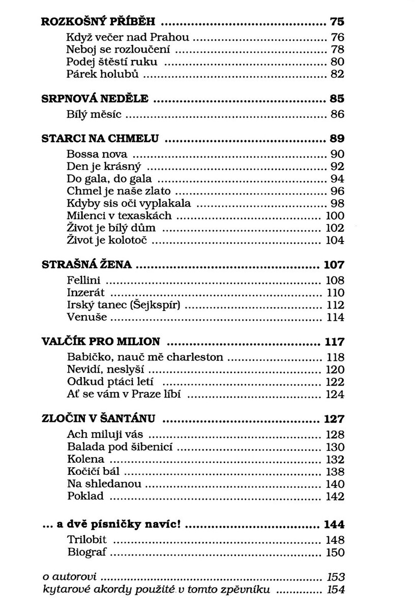 Co je bluesLéta dozrááníZčervenáAž my spoluFašinetářPíšťaličkaŠepityVandrovnickáMilionSvatebníKřidla iluzíRoupyŽhavil BédaKdyby ty muzikyModré punčochyOliver TwistKolíne, KolíneArizonaBalada Mexico KidaHorácův pohřební bluesKdyž v baru houstne dýmMůj bóže, můj bóžeWhisky to je moje gustoSou fár tu ju aj mejPíseň z konce stoletíNás totiž je vícKdyž večer nad PrahouNeboj se rozloučeníPodejštěstí rukuPárek holubůBílý měsícBossa novaDen je krásnýGo gala, go galaChmel je naše zlatoKdyby sis oči vyplakalaMilenci v texaskáchŽivot je bílý důmŽivot je kolotočFelliniInzerátIrský tanec (Šejkspír)VenušeBabičko, nauč mě charlestonNevidí, neslyšíOdkud ptáci letíAť se vám v Praze líbíAch miluji vásBalada podšibenicíKolenaKočičí bálNa shledanouPokladTrilobitBiograf
