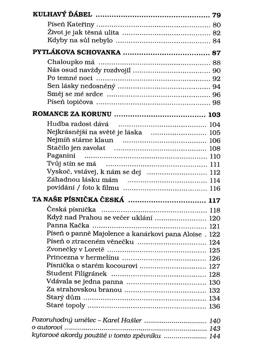 Ke korunce korunaMarieMějte rozum, paní KučerováCo mi scházelo, jsi byla tyDiscopříběhKdyž jsou doma galejeSprávnej časTrhnout seHalelujaJe dusno a těžkoNejkrásnější krajinaNevyplacený bluesProč je to takTy jsišvarnáAlelujaJitrocel a rozmarýnKdyž má láska zelenouLétáníSvatba narubyTo je láskaTrvalo to rokNejsmutnější varietéZnám tolik písníPíseň KateřinyŽivot je jak těsná ulitaKdyby na sůl nebyloChaloupko máNás osud navždy rozdvojilPo temné nociSen lásky nedosněnýSměj se mé srdcePíseň topičováHudba radost dáváNejkrásnější na světě je láskaNejmíň stárne klaunStačilo jen zavolatPaganiniTvůj stín se máVyskoč, vstávej, k nám se dějZáhadnou lásku mámČeská písničkaKdyž nad Prahou se večer ukláníPanna KačkaPíseň o panně Majolence a kanárkovi pana AloisePíseň o ztraceném veněčkuZvonečky v LoretěPrincezna v hermelínuPísnička o starém kocouroviStudent FiligránekVdávala se jedna pannaZa strahovskou branouStarý důmStaré topoly