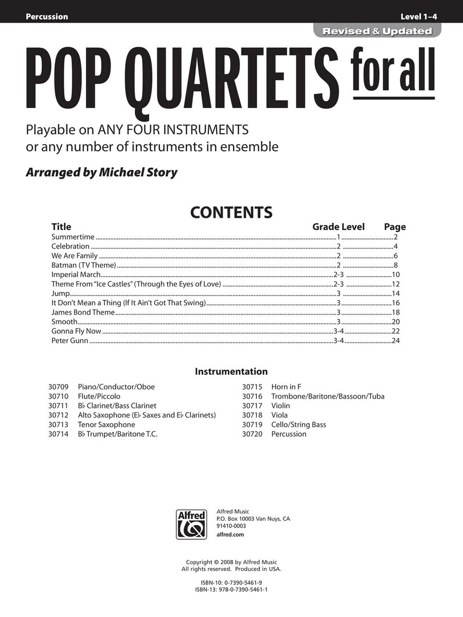 Sešit z úspěšné a nyní nově revidované a upravené sériePOP QUARTETS for all, kde každý sešit této série obsahuje výběr známých evergreenů v úpravě pro čtyři nástroje stejného ladění se stoupající obtížností jednotlivých skladeb (obtížnost 1 - 4). Všechny sešity této série lze mezi sebou vzájemně kombinovat a můžete tak vytvořit hudební soubor pouze z nástrojů, které máte k dispozici a ve kterém mohou hrát každý hlas jiné nástroje. Povedená a velmi variabilní série.